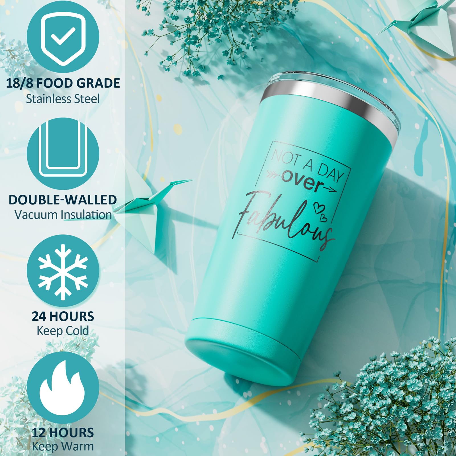 - INSULATED VACUUM TUMBLER: Made of 18/8 food-grade sturdy stainless steel, with double-walled vacuum insulation, this sweat-free insulated tumbler with lid can preserve beverage temperature up to 24h for cold & 12h for hot, great for iced coffee, tea, wine, juice, champagne, smoothies, sodas, milkshake, etc; "Not A Day Over Fabulous", positive quote printing brings her smile & happy mood every day, express your love and care, making it an ideal birthday gifts for her relaxing gifts for women