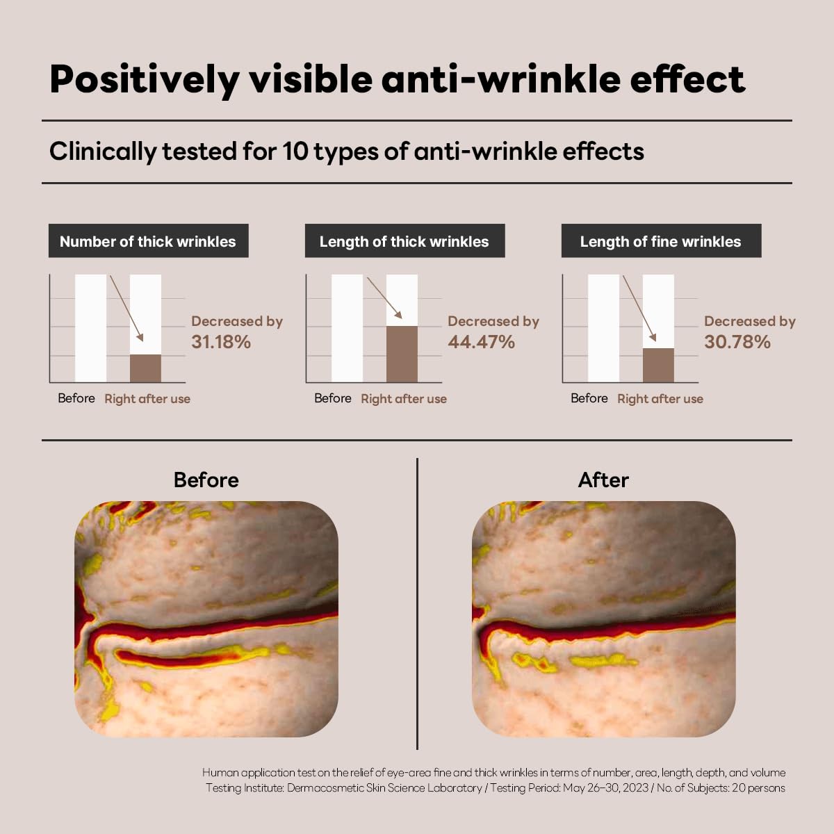 - "Say goodbye to 10 types of eye wrinkles and banish sunken eye concerns! Our product has been rigorously tested to improve fine and deep eye wrinkles, as well as to reduce under-eye bags and boost volume."