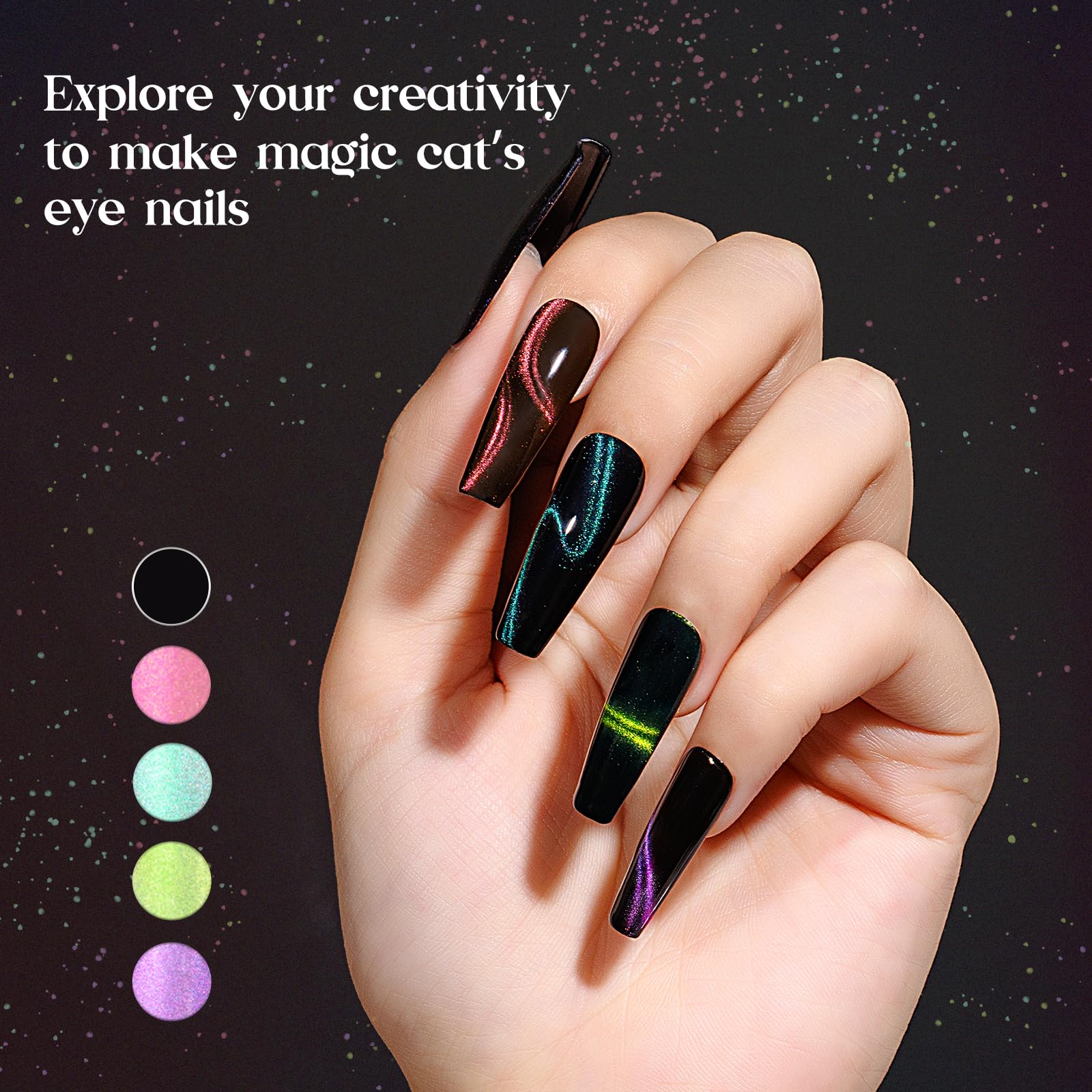 - Vibrant Colors on Nails & Ideal Gift Choice: Colorful chameleon colors cat eye effect and holographic shimmer galaxy effect cateye nail gel, brings you an amazing 9D cat eye effect on nails, to feel the gradient 1 color/dual-color cat eye effect under different lights or angles. Tips: Actual color is based on what you see with the eyes. In addition, It is also a ideal Mother's Day nail gift for ladies.