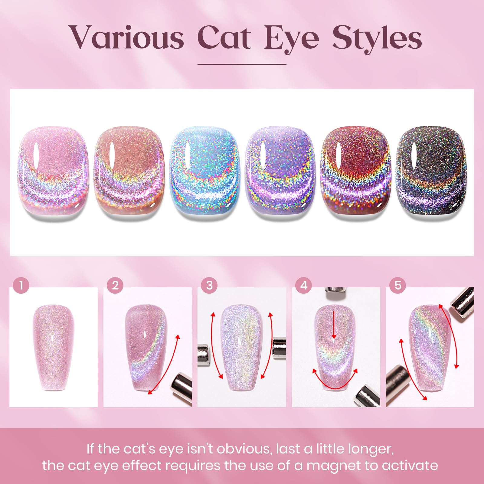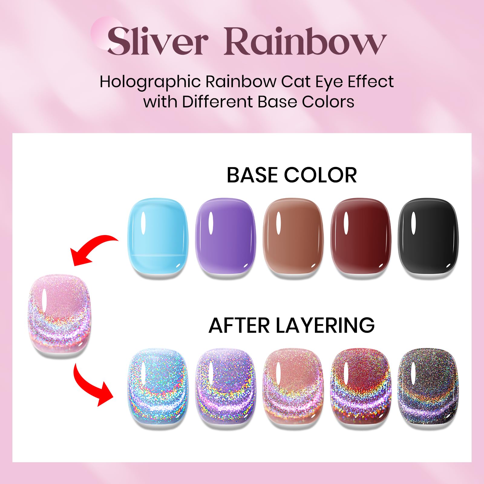 - Different Base Colors Different Holo Effects: The rainbow cat eye nail gel can overlay any base color gel to emit different holographic effects when used on top of any base color. This must-have nail gel is perfect for any occasion and outfit, take your nails to the next level