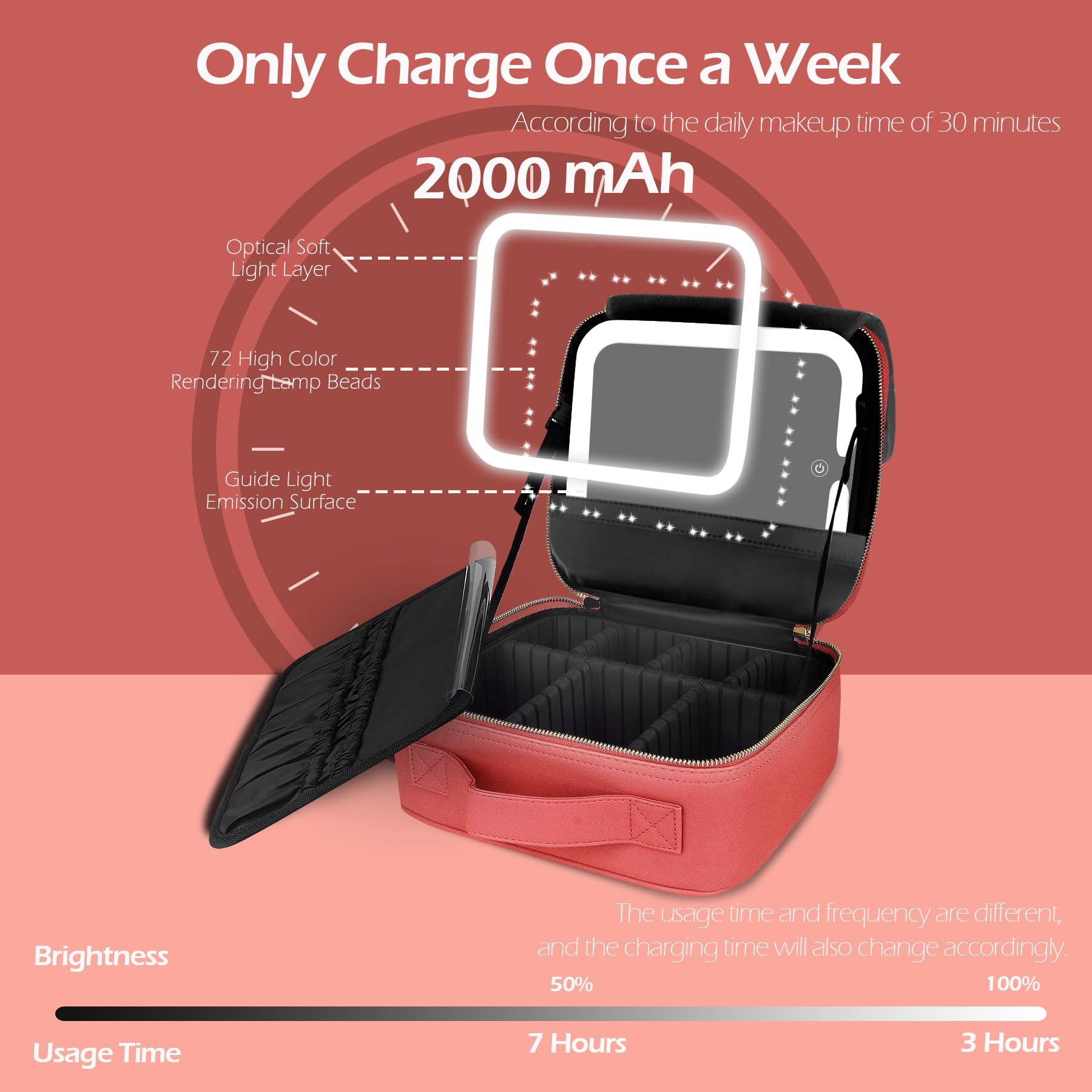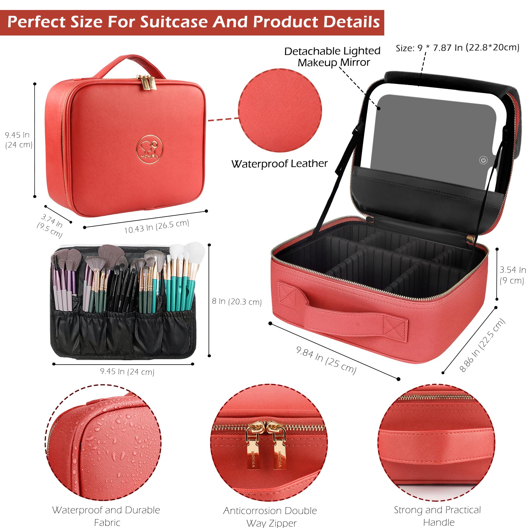 MOMIRA Travel Makeup Bag Cosmetic Bag Makeup Organizer Bag with Large Lighted Mirror 3 Color Scenarios Adjustable Brightness,Red