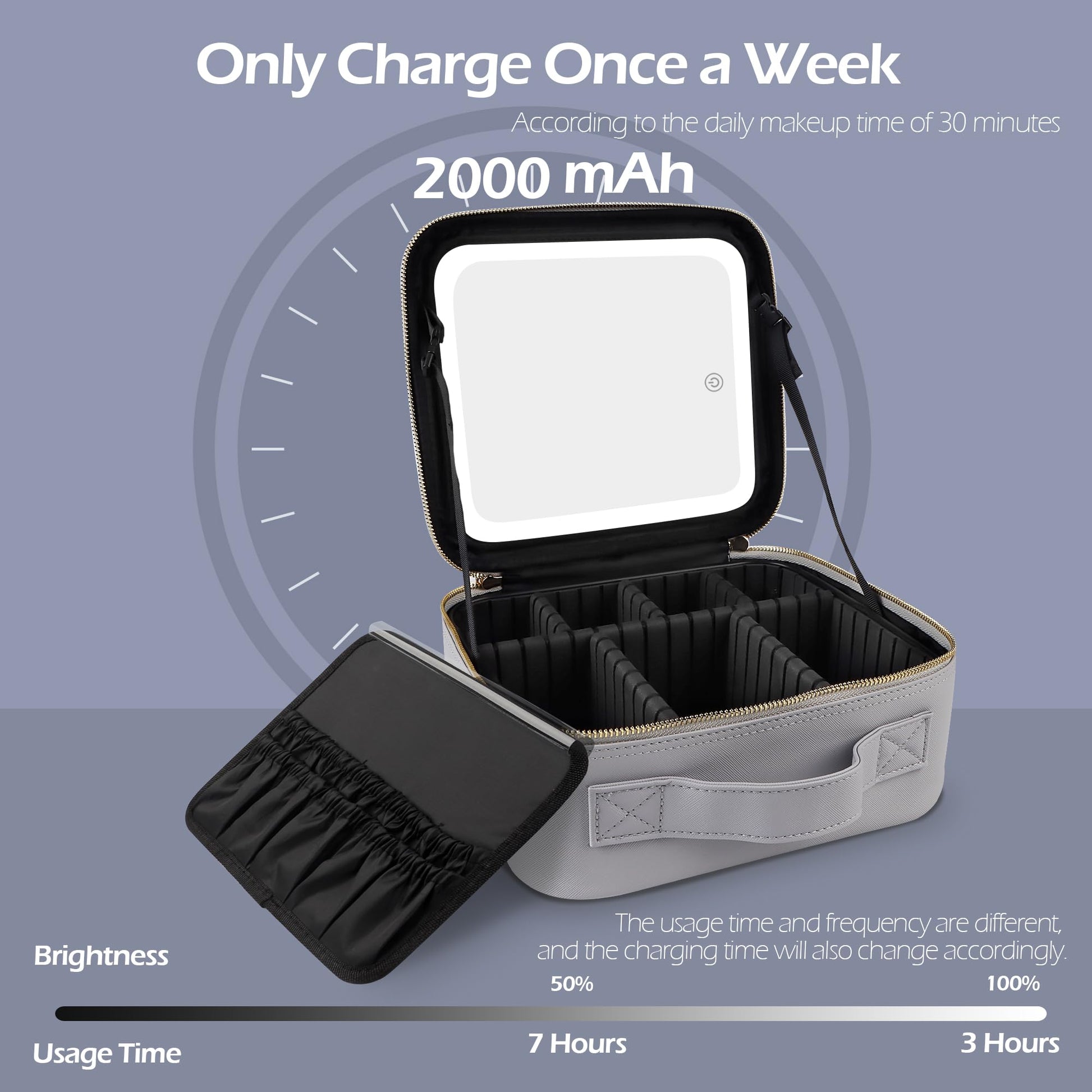 - đăMeticulous Selection of Materials, High Standard ProductionăDouble zippers of this lighted makeup case are controlled by high standards from chain cloth selection, sprocket arrangement, polishing, electroplating, and subsequent oil sealing and waxing processes to ensure smoother pulling. Specially customized sturdy plastic case for fixing the vanity mirror, whether it is placed in the luggage or directly on the car, the mirrorâs surface will not break.