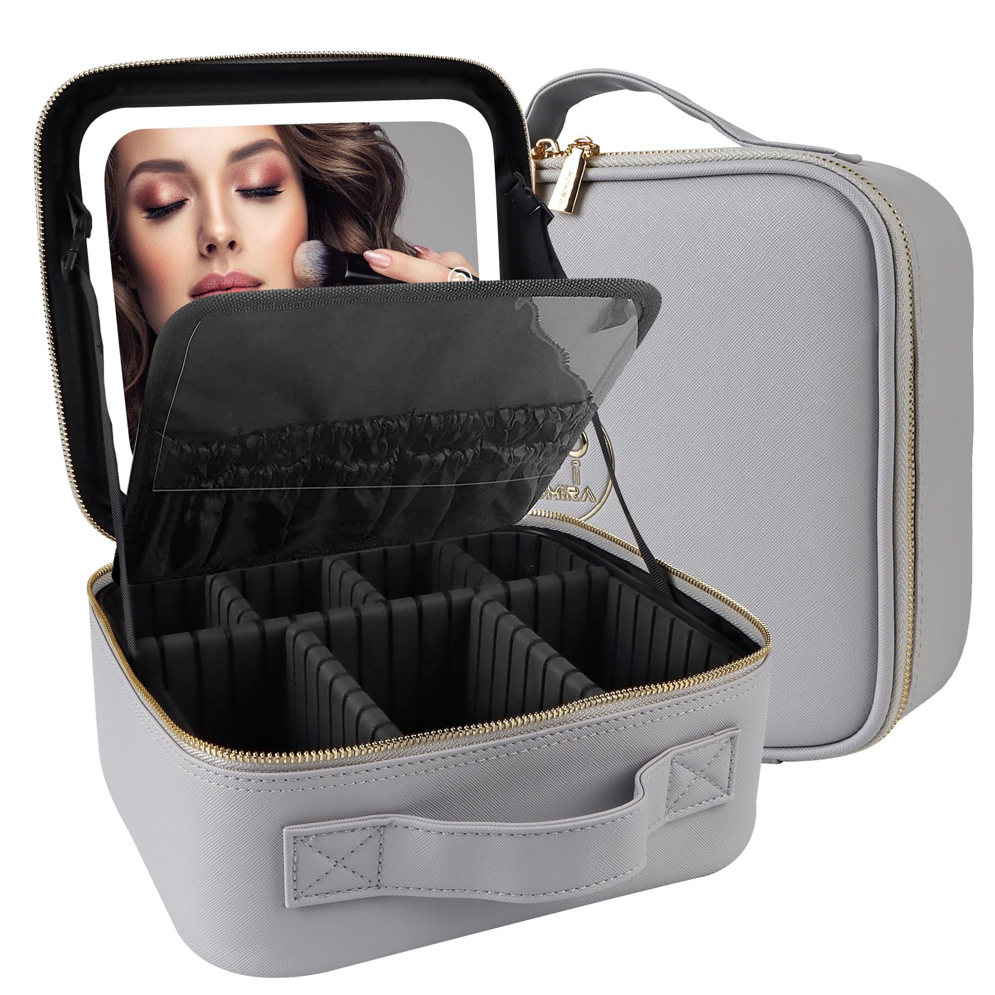 MOMIRA Travel Makeup Bag Cosmetic Bag Makeup Organizer Bag with Large Lighted Mirror 3 Color Scenarios Adjustable Brightness, Waterproof Makeup Travel Case(Grayish)