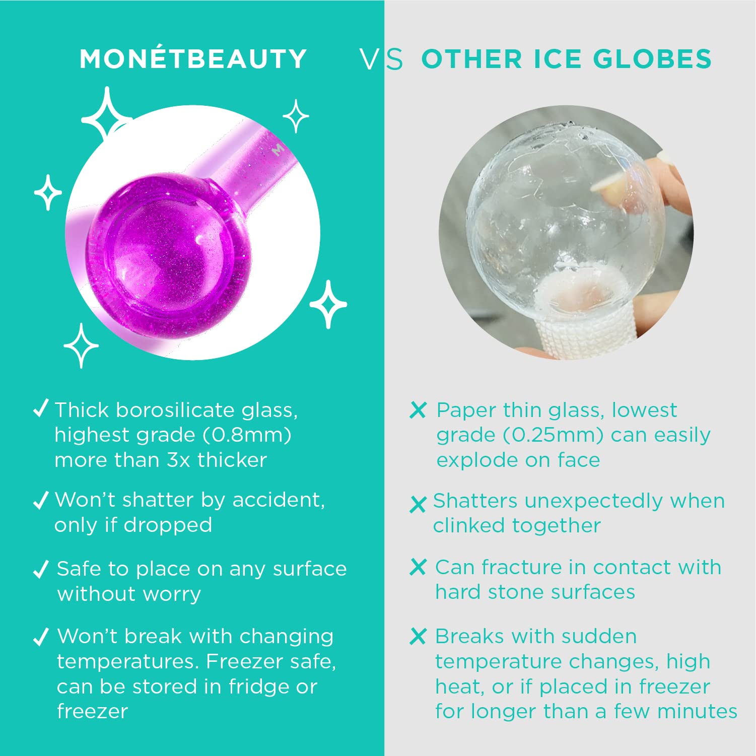 Details: Take Your at Home Spa Experience to the Next LevelOur luxurious facial cooling globes make it easy to perform your own relaxing cryo facial at home. Made with premium quality glass and non-toxic antifreeze liquid, MonétBeauty Ice Globes are durable and freezer safe, so you can have an easy, safe, and relaxing spa experience at home.MonetBeauty Ice Globes come with a Beauty Manual with instruction for how to use, and simple massages to help you achieve the full benefits of ice globe cryo facials. What are the benefits of doing Ice Globe facials?Brighten Skin Tone Facial ice globes boost blood circulation and oxygenation, which helps reduce dark spots and pigmentation to reveal a brighter and healthier complexion.Achieve a More Youthful AppearanceSkin lifting massages with the use of facial ice globes reduces the appearance of fine lines, firm skin, shrink pores to create the appearance of youthful and rejuvenated skin.Slim & Contour Lymphatic drainage massages with the use of facial ice globes stimulates circulation and encourages lymphatic drainage. Reducing facial swelling, for a slimmer more contoured face.De-stress & Relax The cooling and massaging effect of facial ice globes is known to aid in stress relief, headaches, muscle tension, and sinus pain.Are MonetBeauty Ice Globes safe? Unlike other ice globes, MonetBeauty Ice Globes will not break when stored in the freezer. The glass we use has been tested for durability to minimize chances of glass breakage with use.