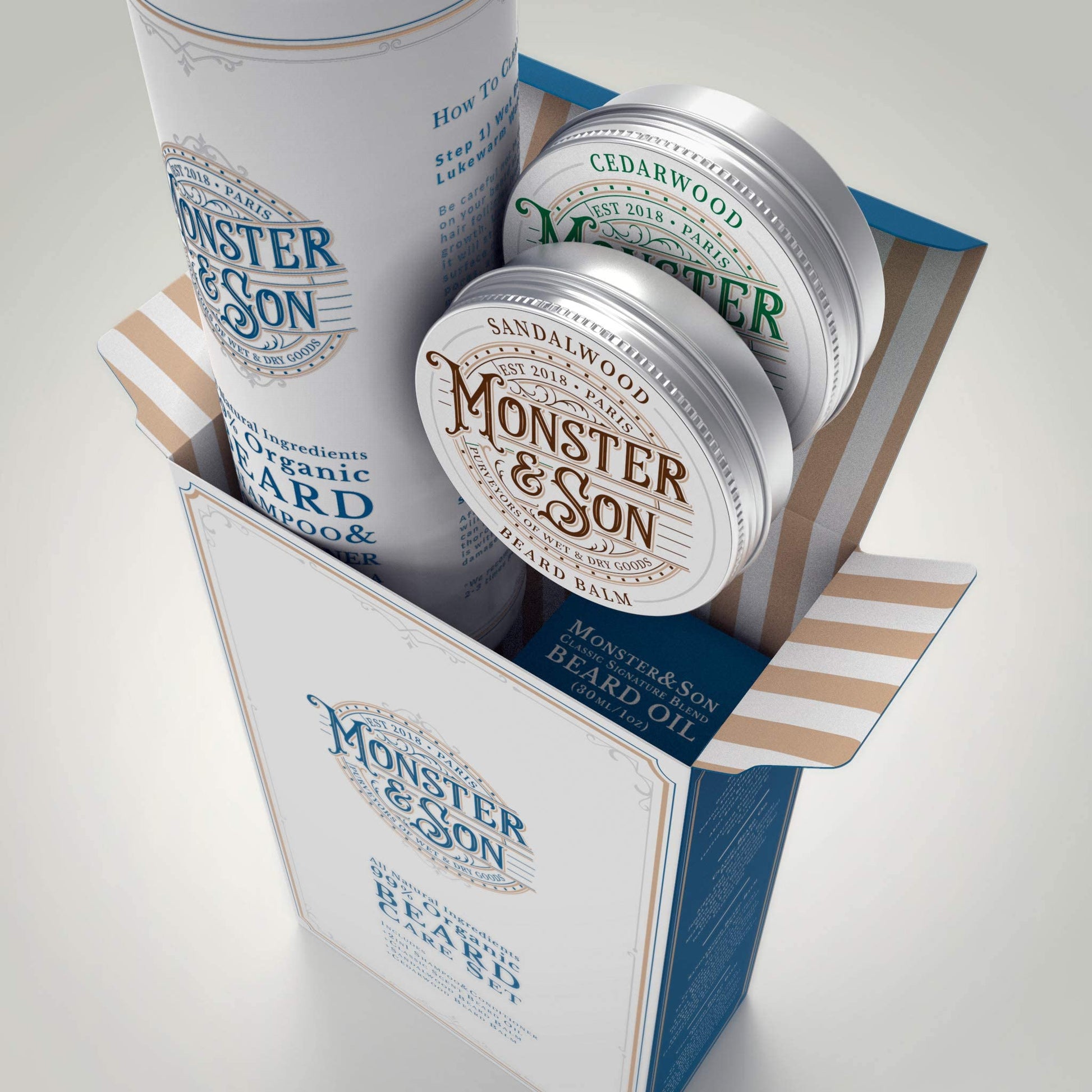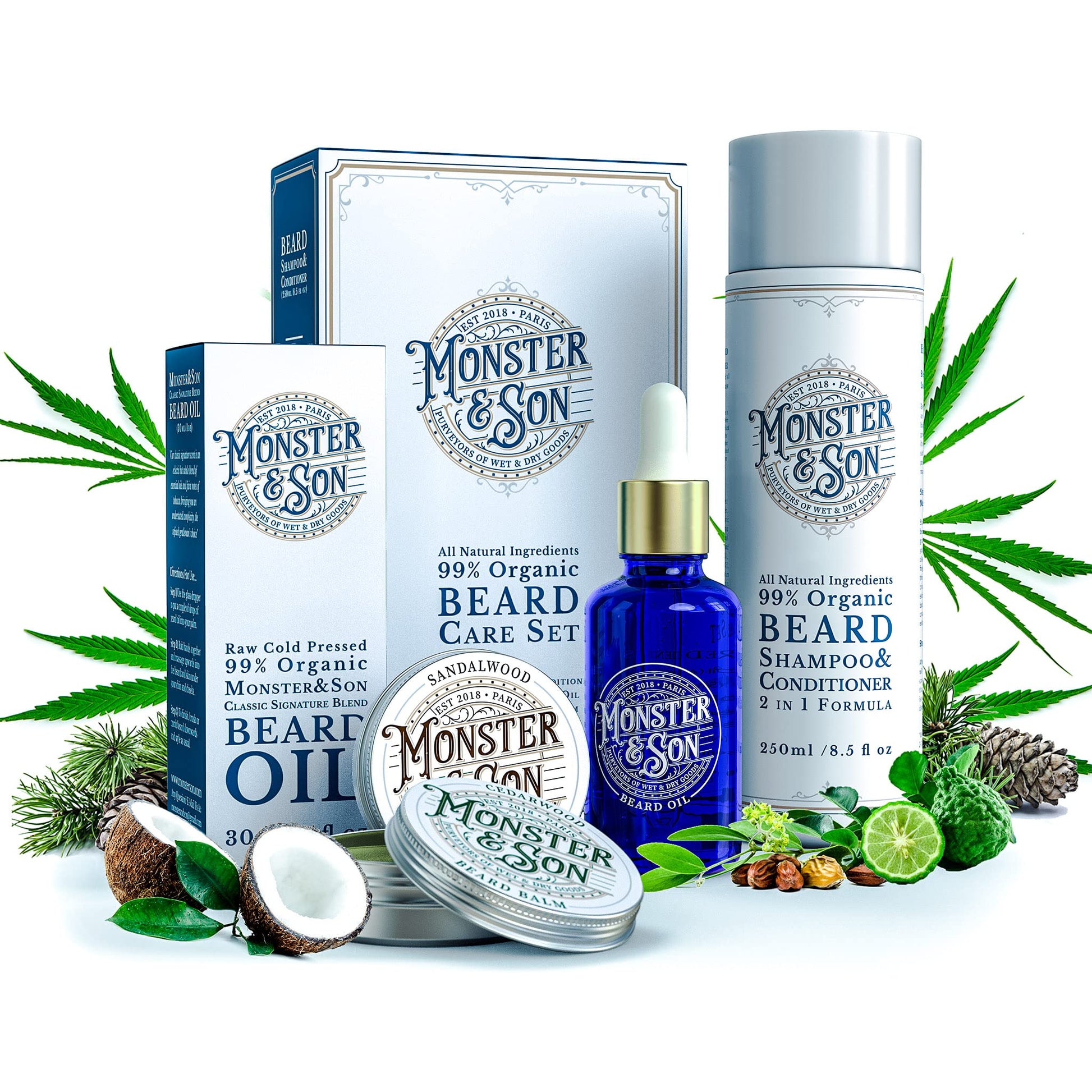 - 👉 PREMIUM BEARD CARE SET - Each Monster&Son beard care set includes our 2in1 Beard Shampoo and Conditioner, Signature Scent Beard Oil, Sandalwood (with Frankincense) Beard Balm and Cedarwood (with Lemongrass) Beard Balm.