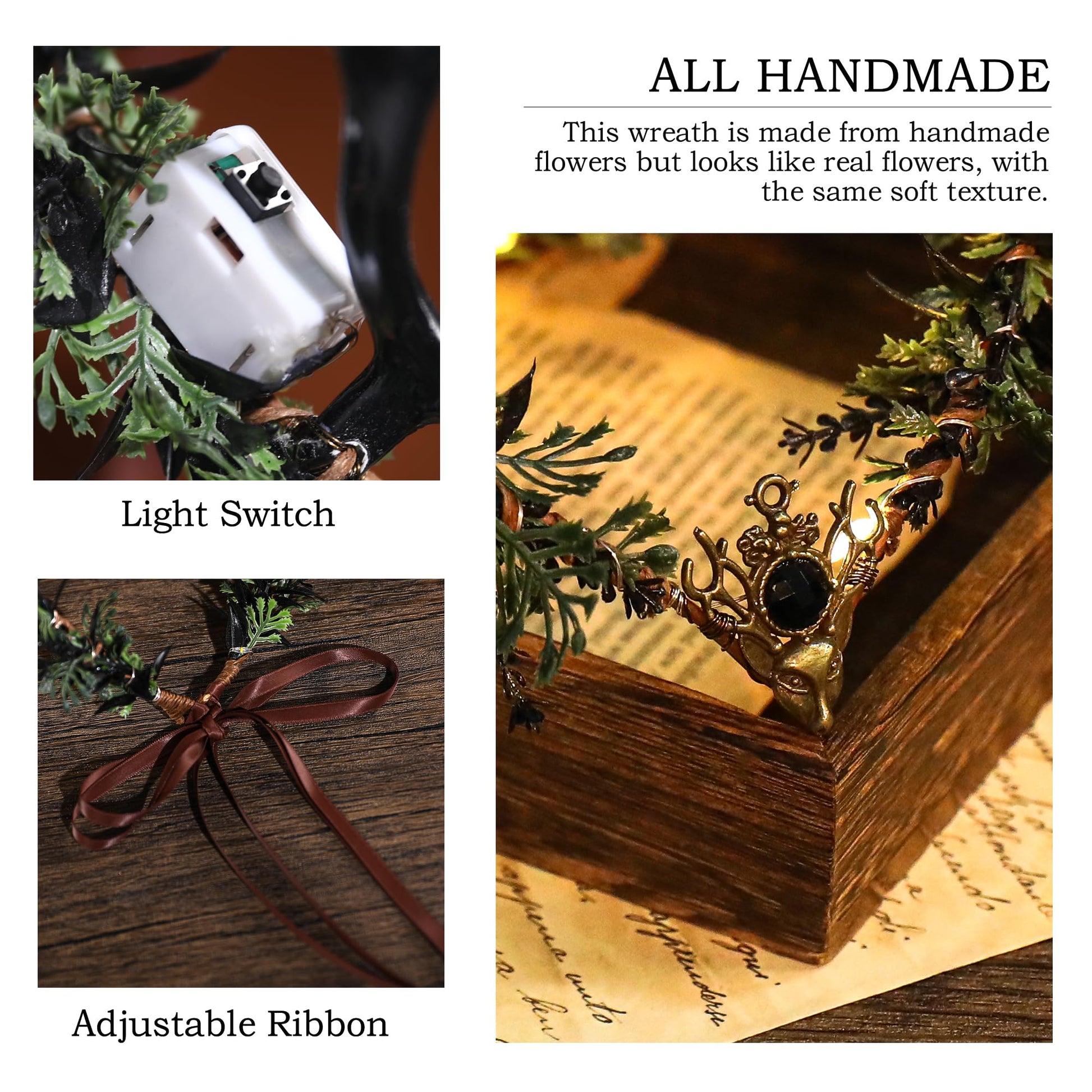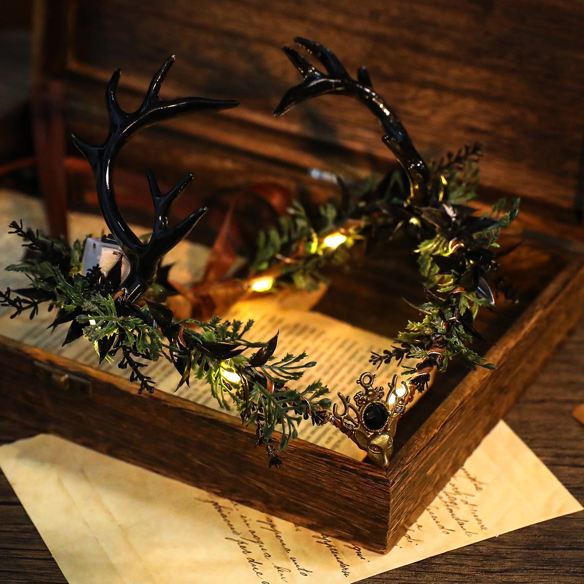 MOSTORY Light up Elf Crown - Black Antler Headpiece Gothic Flower Circlet Elven Woodland Tiara for Women Renaissance Fair Cosplay Halloween Costume Photo Shoot