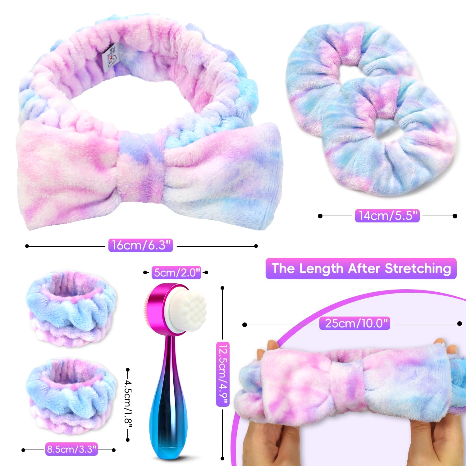 my novel things Facial Cleansing Brush, Headband for Washing Face with Silicone Double Side Manual Face Scrubber Brush, Skincare Headband and Wristband Set, 2 Hair Scrunchie, for Makeup Rainbow