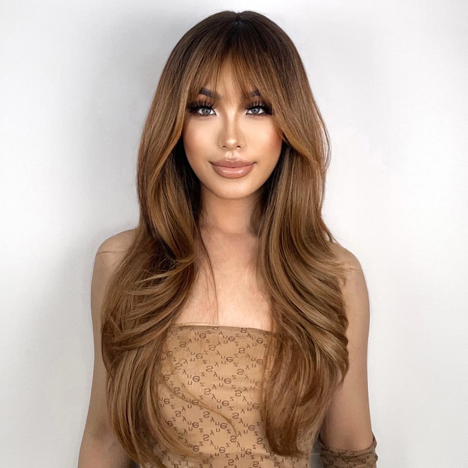 N NAYASA Light Brown Wigs for Women Brown Wig with Bangs 24‘’Ombre Brown Wig with Dark Roots Long Layered Wig Heat Resistant Synthetic Wig Natural Looking Wigs for Daily Party Use