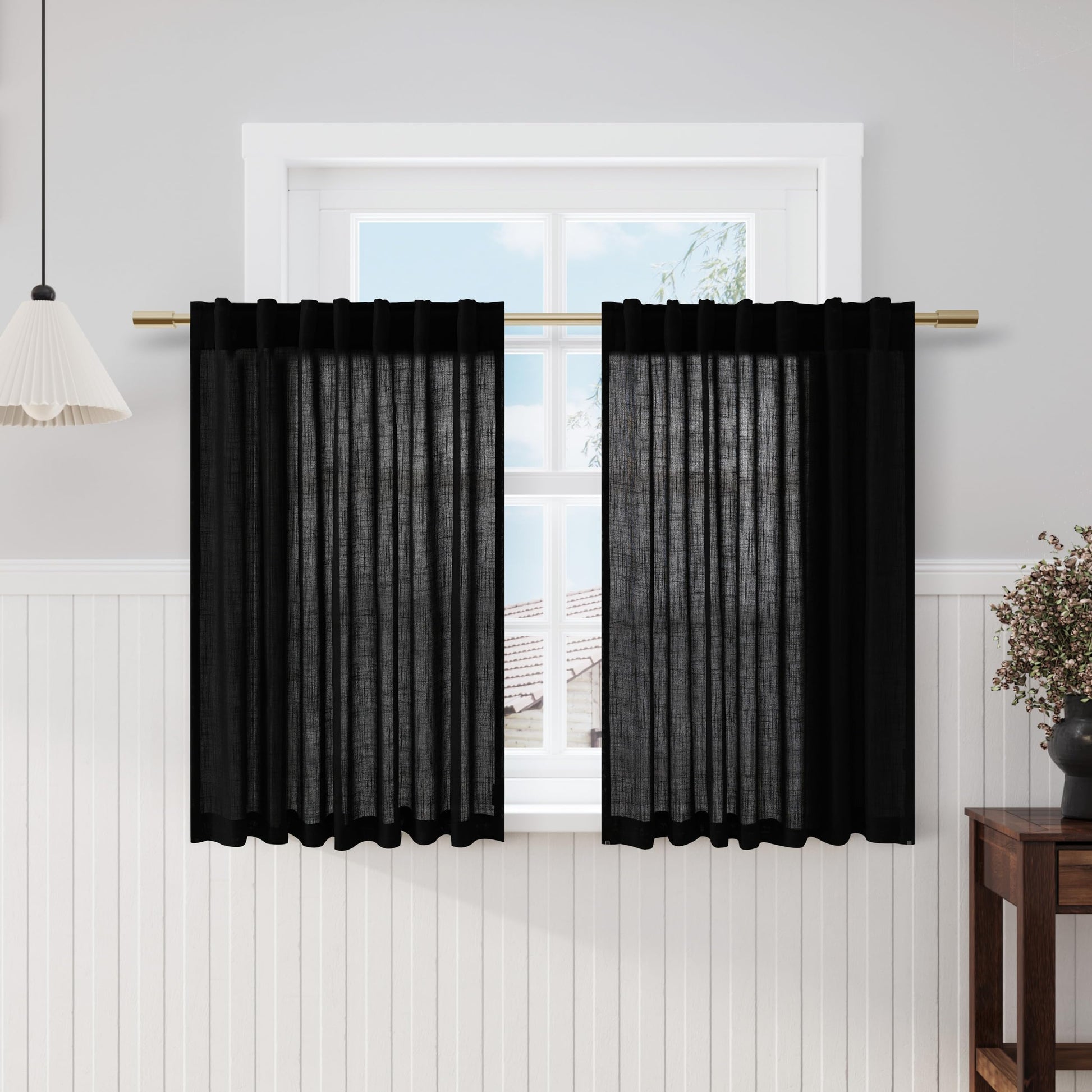 READY MADE: 2 Linen Curtain Panels per package.Each panel measures 25 inches wide by 24 inches long. Top design of Back tab & loop pocket provide 3 hanging options. <1> hanging from the back patch to create an elegant pleated look, <2> from the 3 inch rod pocket for a classic look <5> Hanging with clip rings for easy, slide open and closed (clip rings are not included)