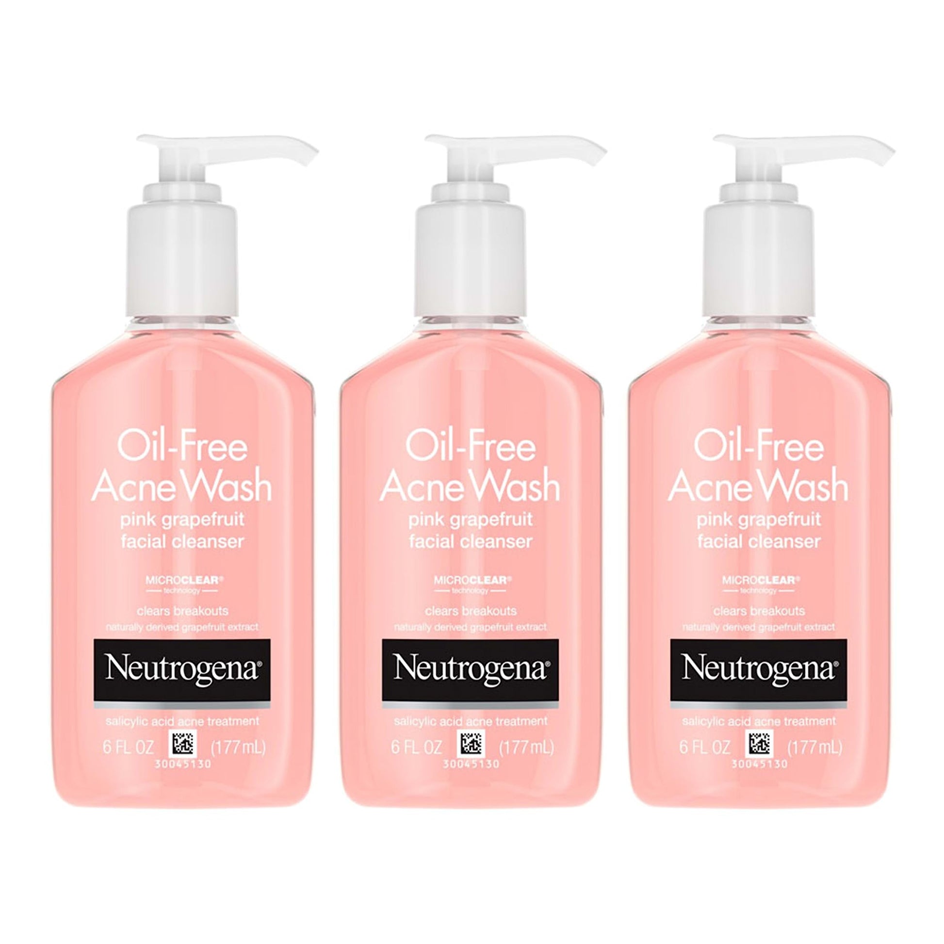 Neutrogena Oil-Free Pink Grapefruit Pore Cleansing Acne Wash and Daily Liquid Facial Cleanser with 2% Salicylic Acid Acne Medicine and Vitamin C, 6 fl. oz, 3 Pack