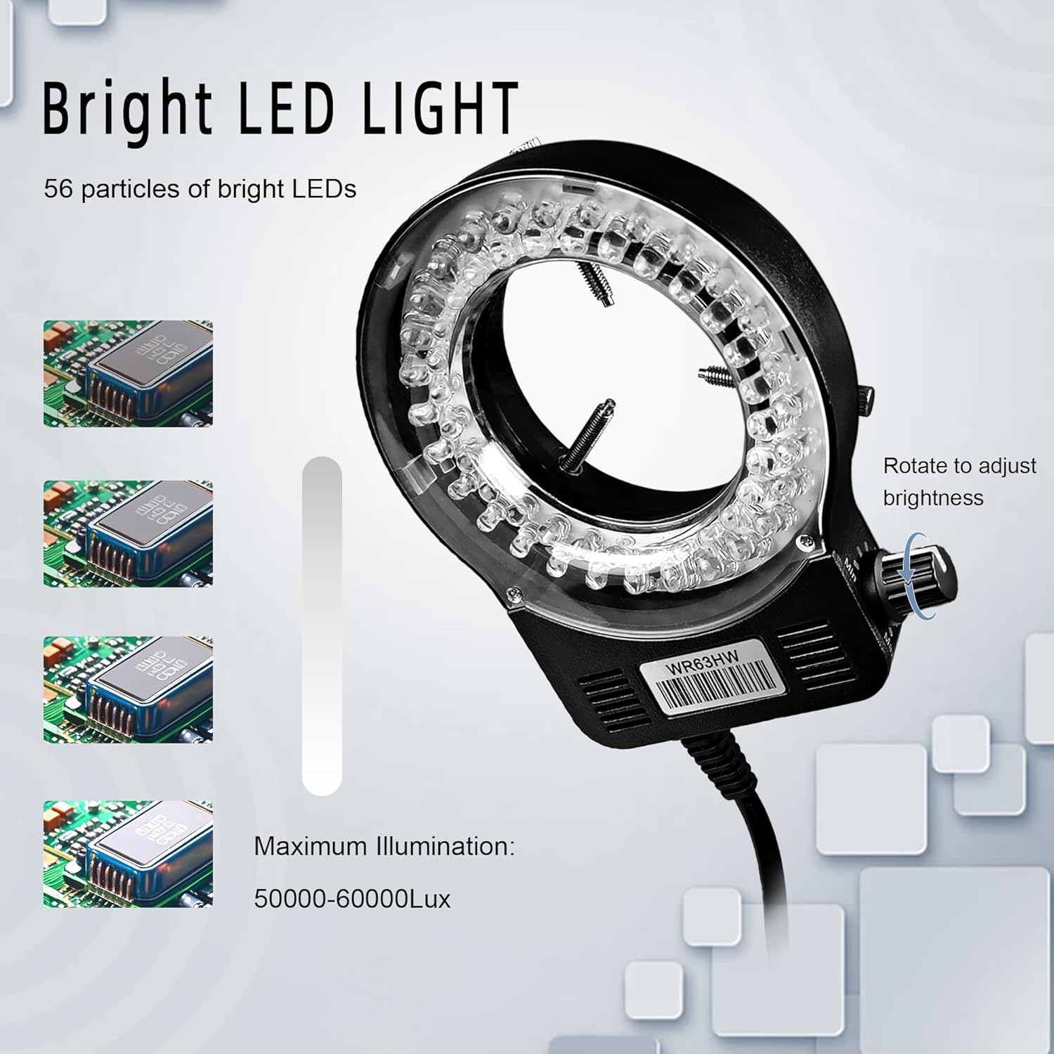 - Bright LED Light:The industrial microscope is equipped with a bright LED ring light, the ring light consists of 56 bright LED beads, the color temperature of the light is 6500K-7000K. The ring light can be adjusted to adjust the brightness, and its maximum illuminance is 60,000 Lux. The ring light enables the video microscope to get clearer pictures and videos when working.