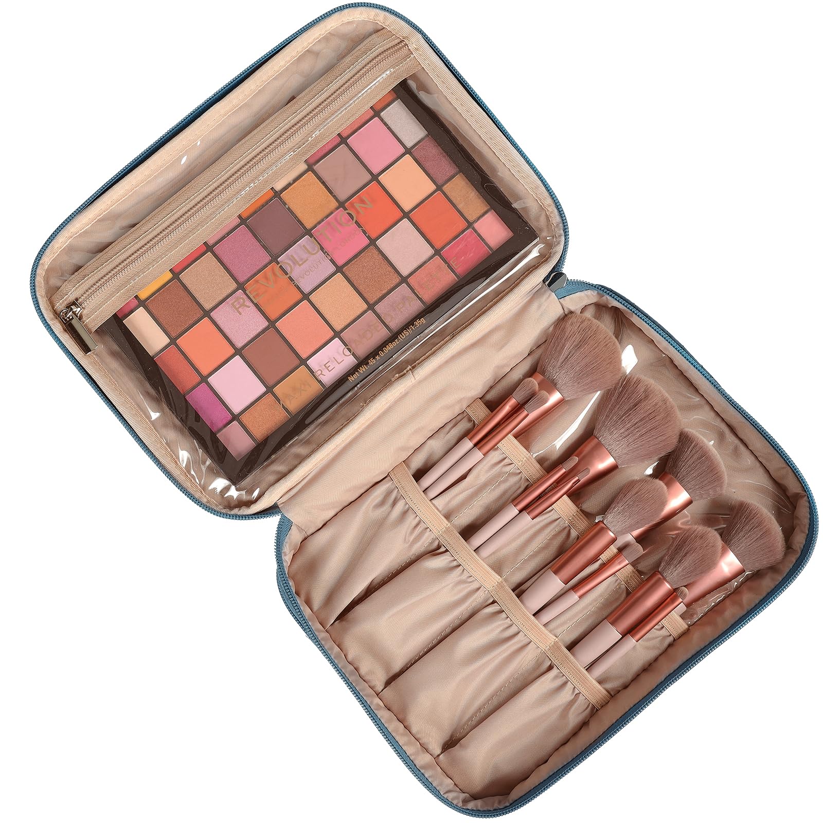 - HOLDS SUBSTANTIAL MAKEUP BRUSHES - There are eight brush slip pockets on the top compartment to fit different sizes of brushes. The clear plastic lining provides an easy-to-clean surface