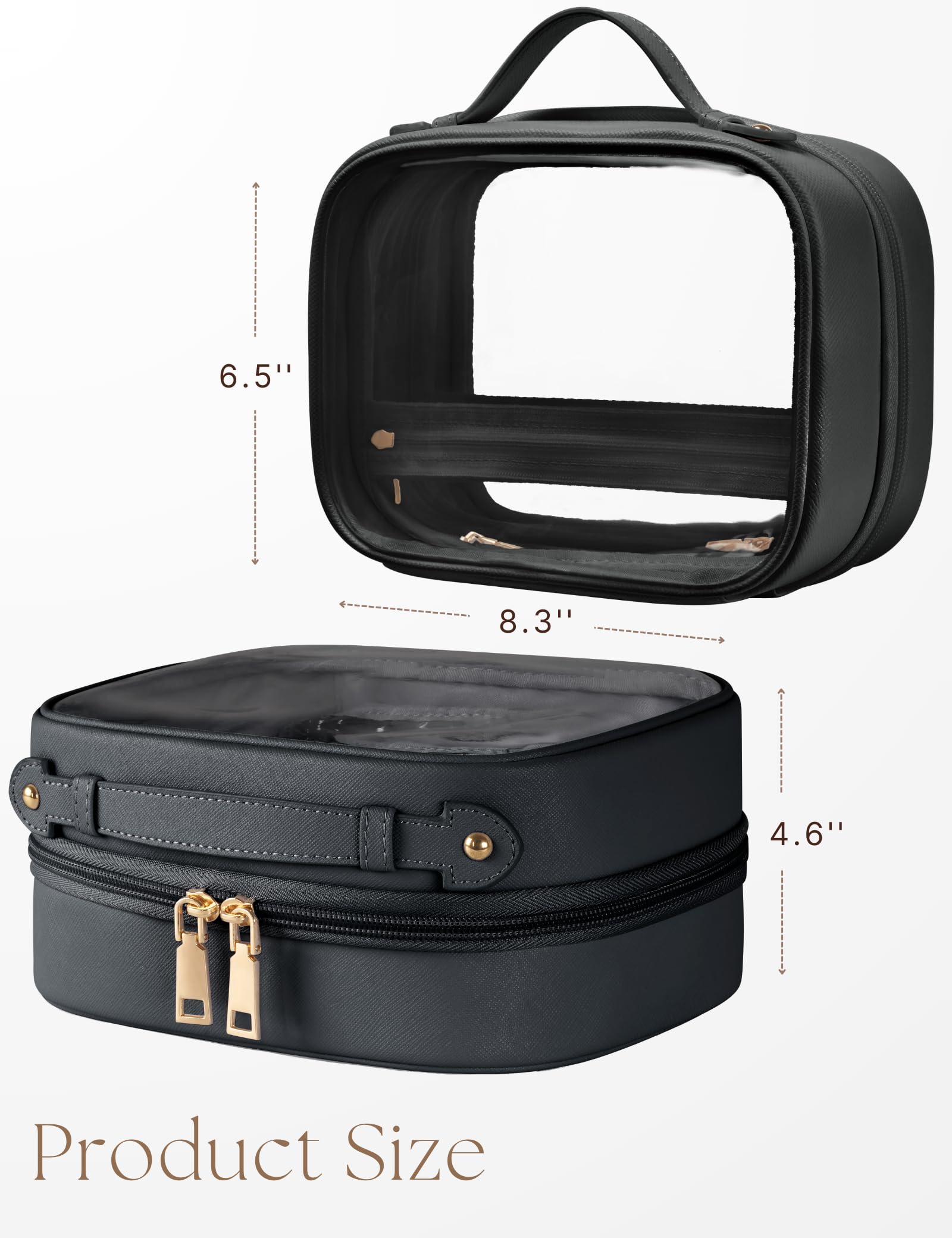 Oaque Clear Cosmetic Bag Double Layer Travel Toiletry Bag Clear Makeup Bag Case with Zipper Transparent Travel Bag for Toiletries, TSA Approved Toiletry Bag for Women Girls (Black)
