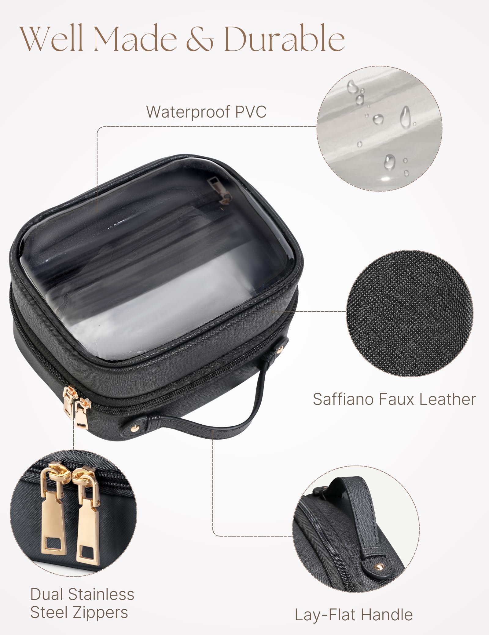 - Well Made Cosmetic Bag: Made of premium saffiano faux leather and clear PVC, the toiletry case is scratch resistant, waterproof and easy to clean. This clear toiletry bag boasts dual stainless steel zippers and a lay-flat handle for added durability and convenience.