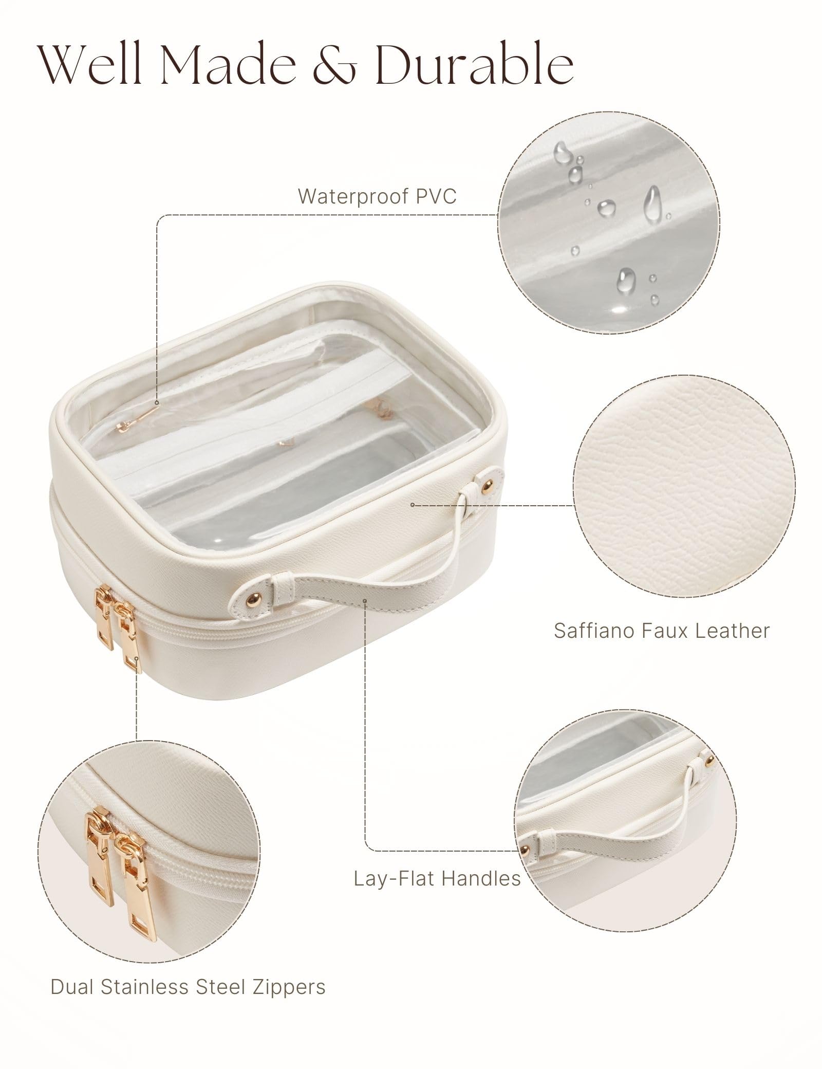- Well Made Cosmetic Bag: Made of premium saffiano faux leather and clear PVC, the toiletry case is scratch resistant, waterproof and easy to clean. This clear toiletry bag boasts dual stainless steel zippers and a lay-flat handle for added durability and convenience.