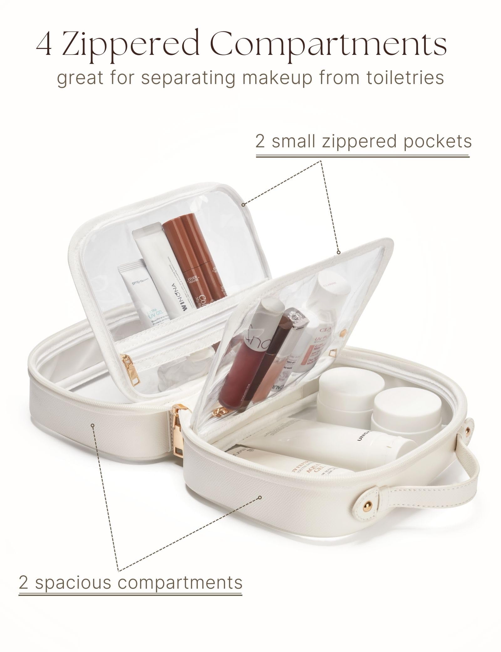- 4 Separate Compartments: The clear make up case features two small zippered pockets and two large zippered compartments that offer ample space for a variety of travel-sized skin care, beauty, or makeup products. A great option for separating makeup from toiletries.