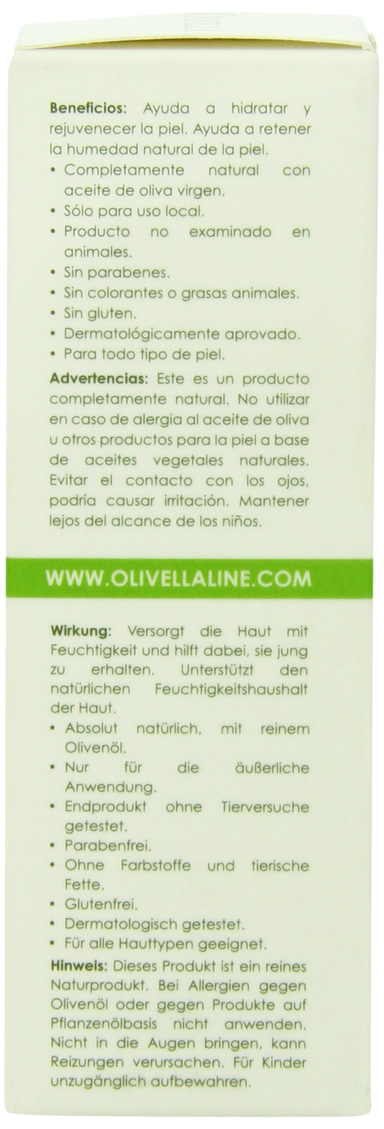 Details: Helps moisturize and rejuvenate skin. Helps retain skin's natural humidity. Contains Antioxidant vitamin E Tocopherol, Phenolic Antioxidants (present in Virgin Olive Oil) and anti-aging properties.With more then sixty years experience, parent company Umbria Olii S.p.A., a leading international provider of premium olive oil turns its focus to personal skin care. Olivella was developed to re-introduce the secrets of 100% Virgin Olive Oil skincare dating back to Italy's centuries old historical roots.Olivella products not tested on animals.