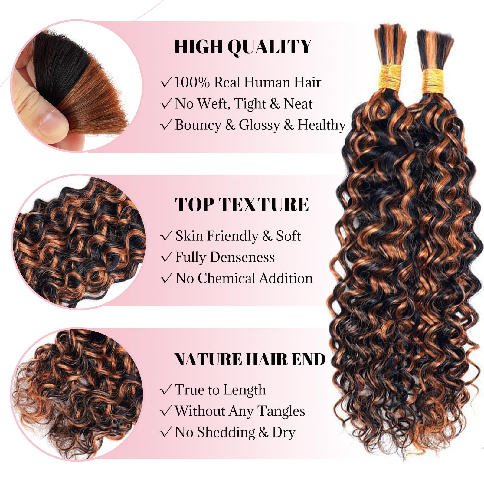 - 【Hair Color】Deep water wave bulk human hair for Braiding is available in solid (Natural color, 27#) and highlight ombre colors (P4/27,1B/30) to meet your different style preferences. The color of human braiding hair is as the pics show, hair color may appear different due to lighting and other factor affect.