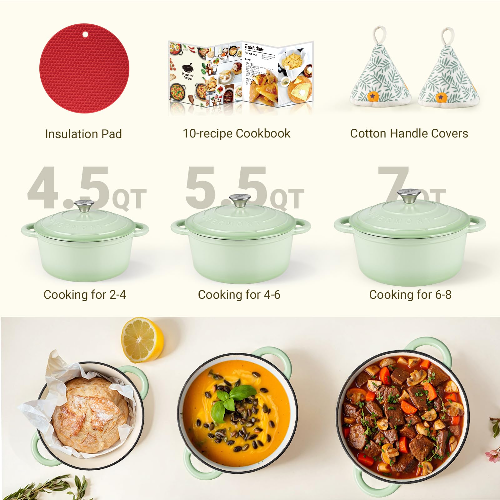 Overmont Enameled Cast Iron Dutch Oven - 4.5QT Pot with Lid Cookbook & Cotton Potholders - Heavy-Duty Cookware for Braising, Stews, Roasting, Bread Baking bottle green