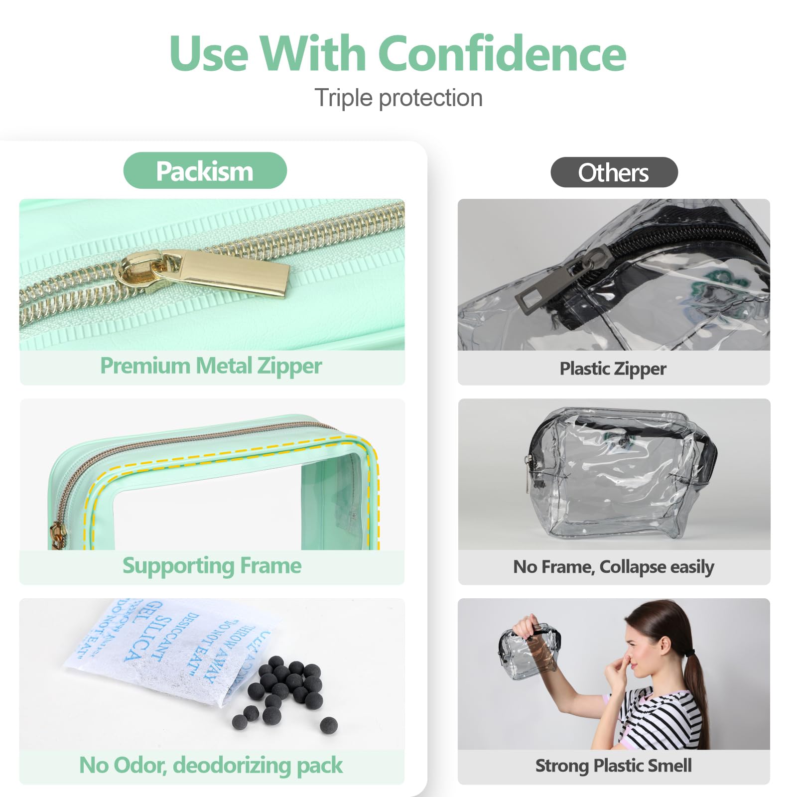 PACKISM TSA Approved Toiletry Bag - Light Green Turtle Leaves Print Clear Shell Bag and Upgrade Color-Edged Clear Toiletry Bags, Perfect for On the Go or Travel, Lightweight and Robust, 2 Pack