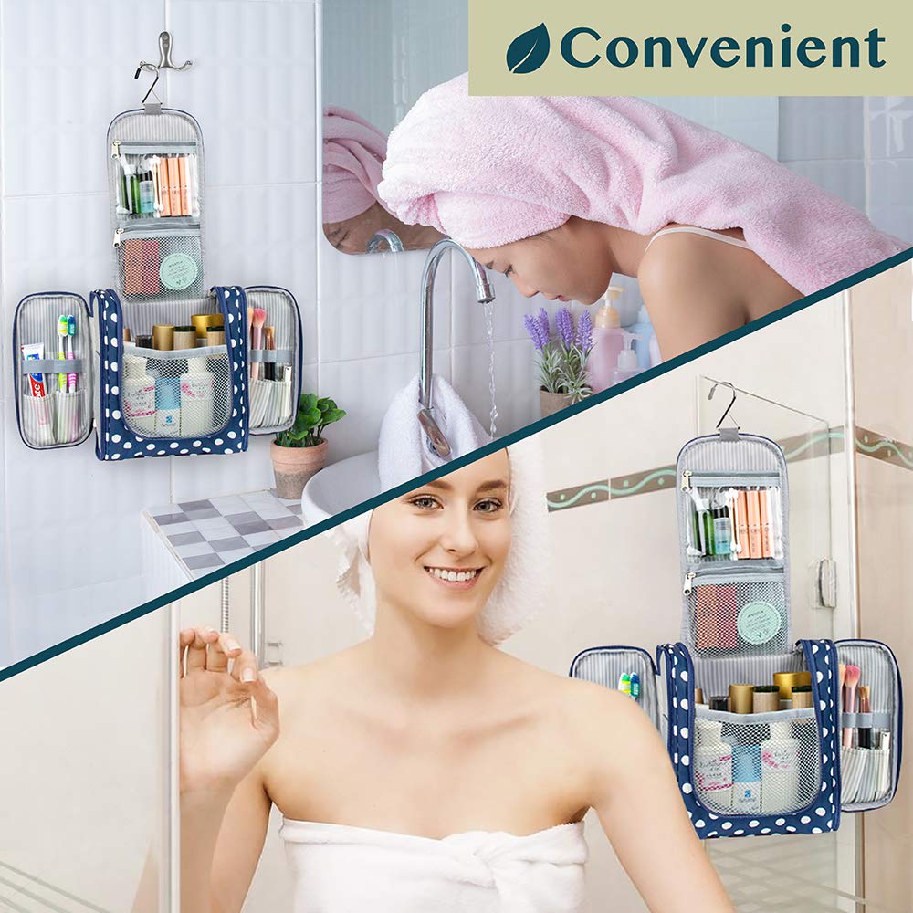 - COSMETICS TRAVEL BAG ORGANIZER: This toiletry bag for women has a hanging hook and multiple pockets that help you stay organizer during business trip, vacation travel. The hanging hook makes it easy to hang the toiletry bag to bars in the hotel shower bathroom. Unzip your toiletry bag to reveal compartments to organize your shampoo, skincare face hygiene products. This toiletry travel bag is an essential accessory for cruise in Europe, plane, Hawaii Trip, and honeymoon.