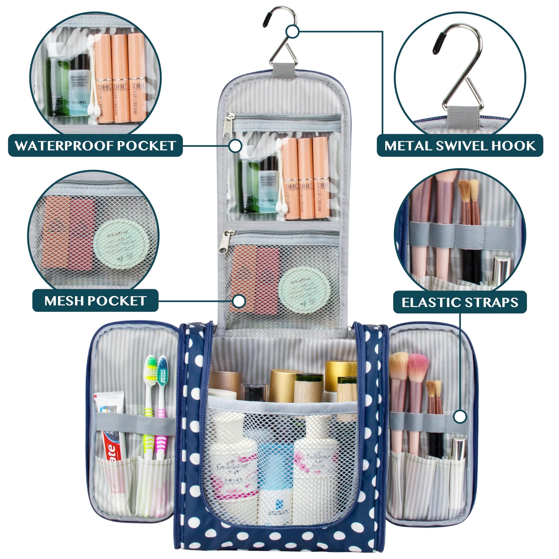 PAVILIA Toiletry Bag Travel Bag for Women Men, Hanging Cosmetic Organizer, Water Resistant Makeup Bag for Accessories Toiletries, Large Travel Essentials Kit (Navy Polka Dot)