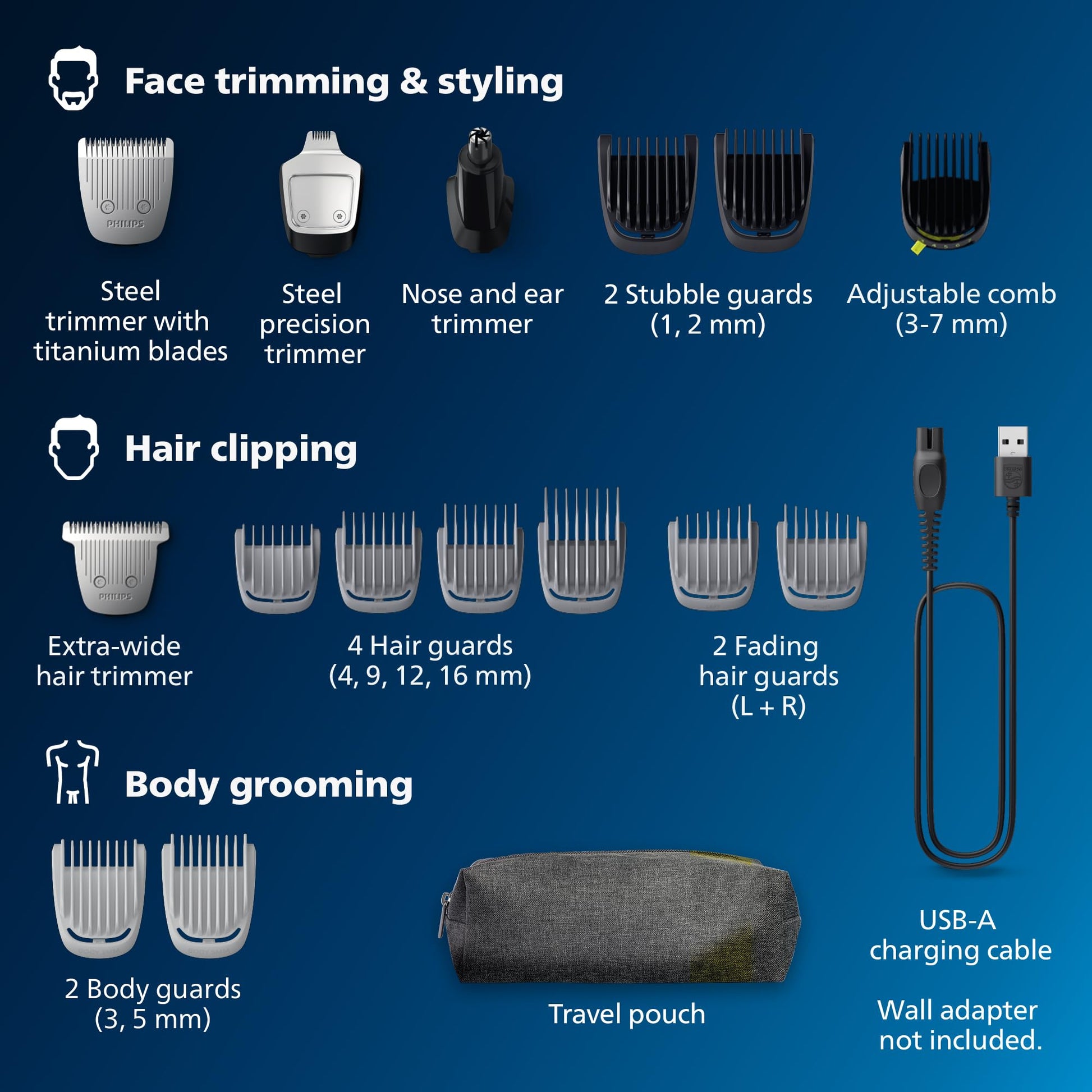Details: The Philips Norelco Multigroom 5000 is the all-in-one trimmer for maximum versatility. It boasts titanium-coated self-sharpening steel blades that never need blade oil, stay as sharp as day one, and don't rust. Create clean, straight lines for a perfect finish and craft your own personal look with a durable hair trimmer for men with 18 quality tools for styling your face, hair, head and body. The Multigroom 5000 also features the extra-wide T-blade for easy hair and beard trimming across large areas, as well as the adjustable 3-7mm comb for a personalized look. With the nose and ear hair trimmer attachment, you can easily remove unwanted nose and ear hair. The long-lasting lithium-ion battery provides up to 3 hours of runtime for long life and maximum power. The no-slip rubber grip improves comfort and control. For easy cleaning, remove the heads from the handle and rinse them under the tap. USB-A charging cable included (wall power adapter not included).