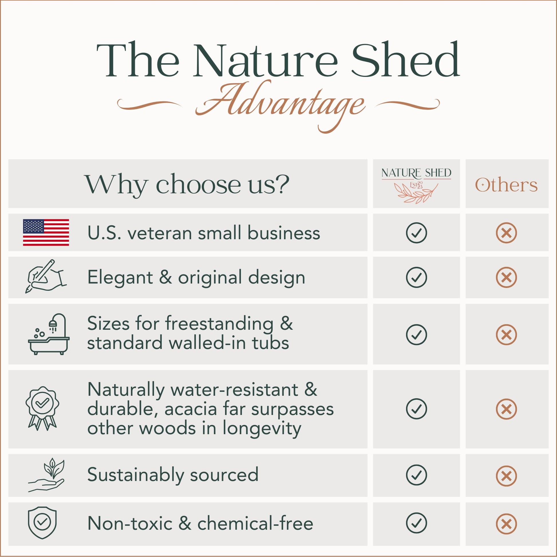 - Luxury Crafted Acacia Wood Bath Tray: Nature Shed’s tray is made from sustainably sourced solid acacia wood, offering superior durability and water resistance for your luxury bath. Acacia wood naturally withstands water exposure extremely well, and our non-toxic finish further protects the bath table from water damage.