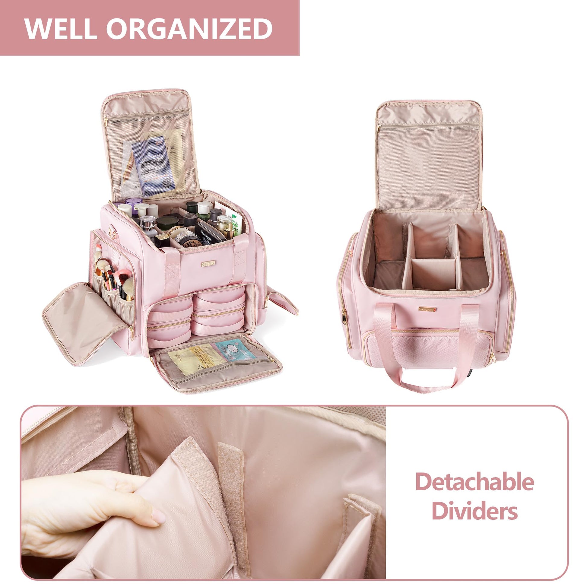 - 【PROFESSIONAL MAKEUP CASE】 The rolling makeup suitcase features double layers design to hold all makeup essentials. Upper compartment can be divided into 4 areas by 2 adhesive dividers. A mesh pocket in the top flap for keeping facial mask, samples, etc. (Empty bag only, NOT includes any supplies.)