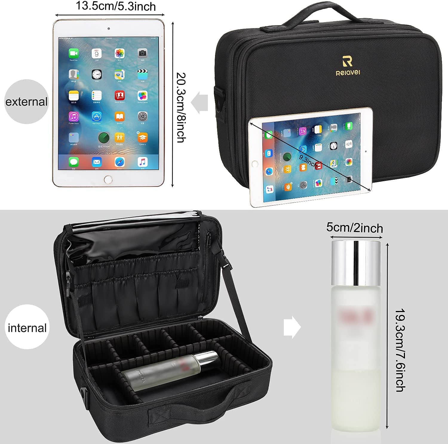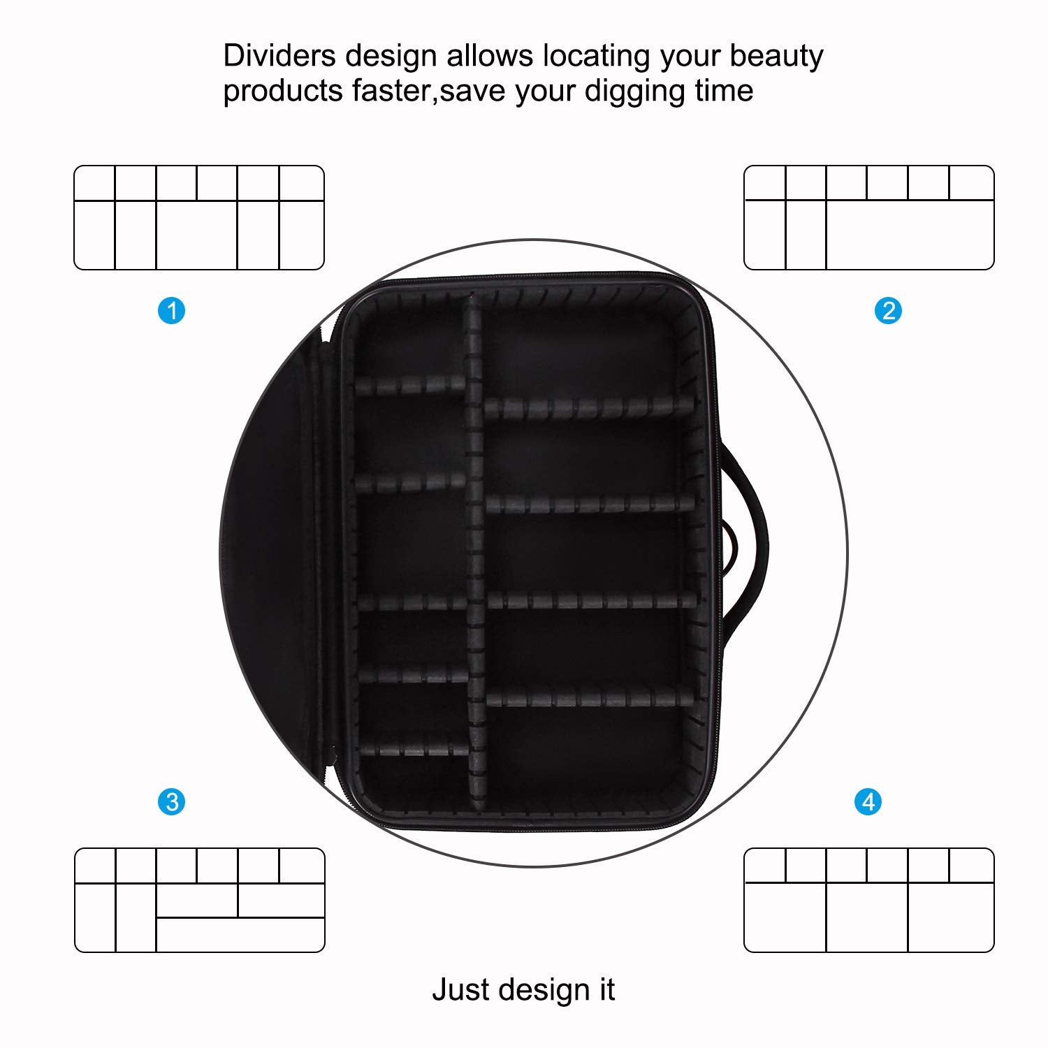 - ADJUSTABLE COMPARTMENTS AS NEEDED: The Travel Makeup Case with adjustable dividers, can adjust the divider to fit the cosmetics. Three large zipper pocekts for the large palettes or cosmetic tools.