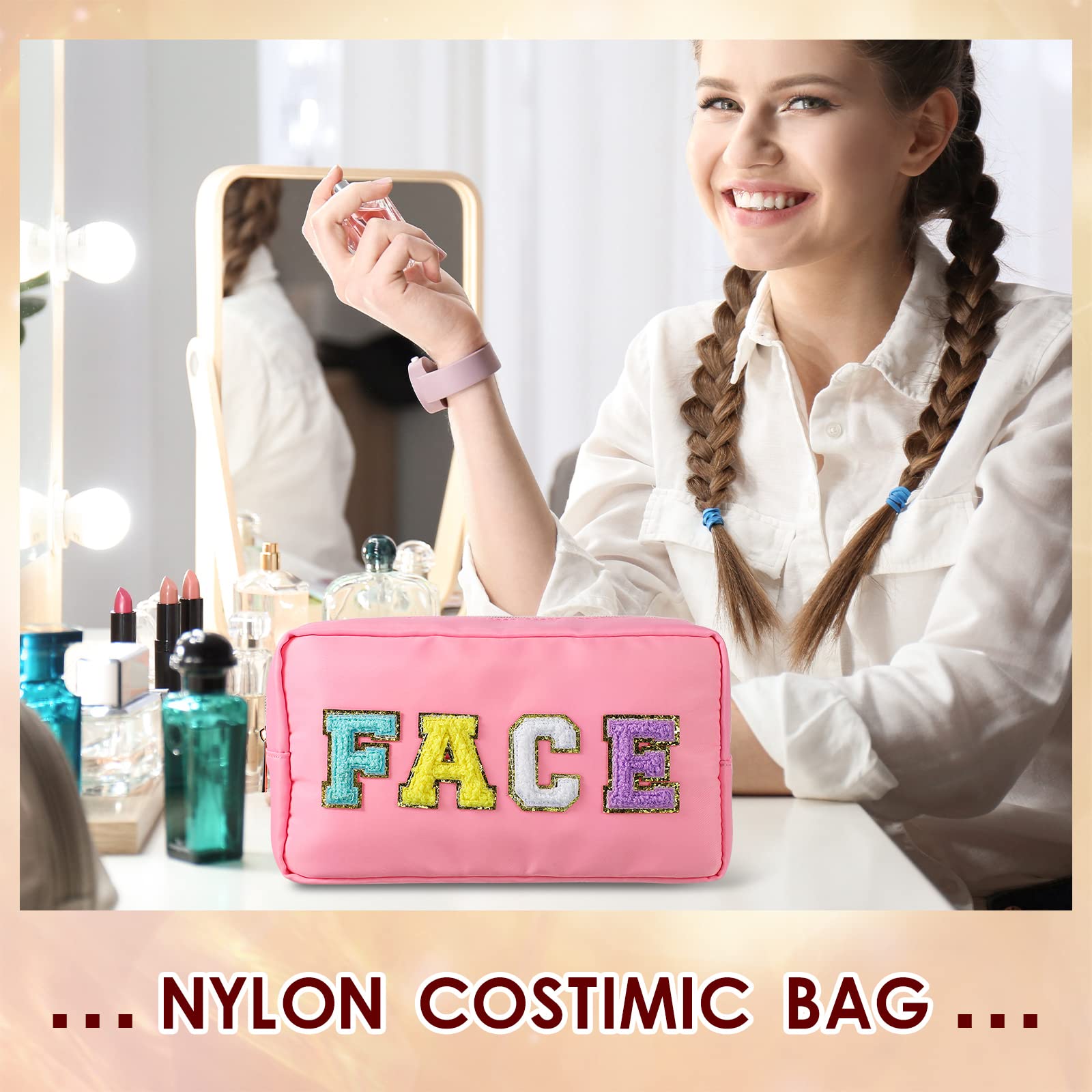 - Glitter Chenille Letters Design: the nylon cosmetic bag has glitter letter patches; The monogram is made of delicate embroidery and non woven fabric, stitched securely to the bag; You don't have to worry about them falling off; These colorful letters with glitter border make your travel makeup bag look more attractive and vivid