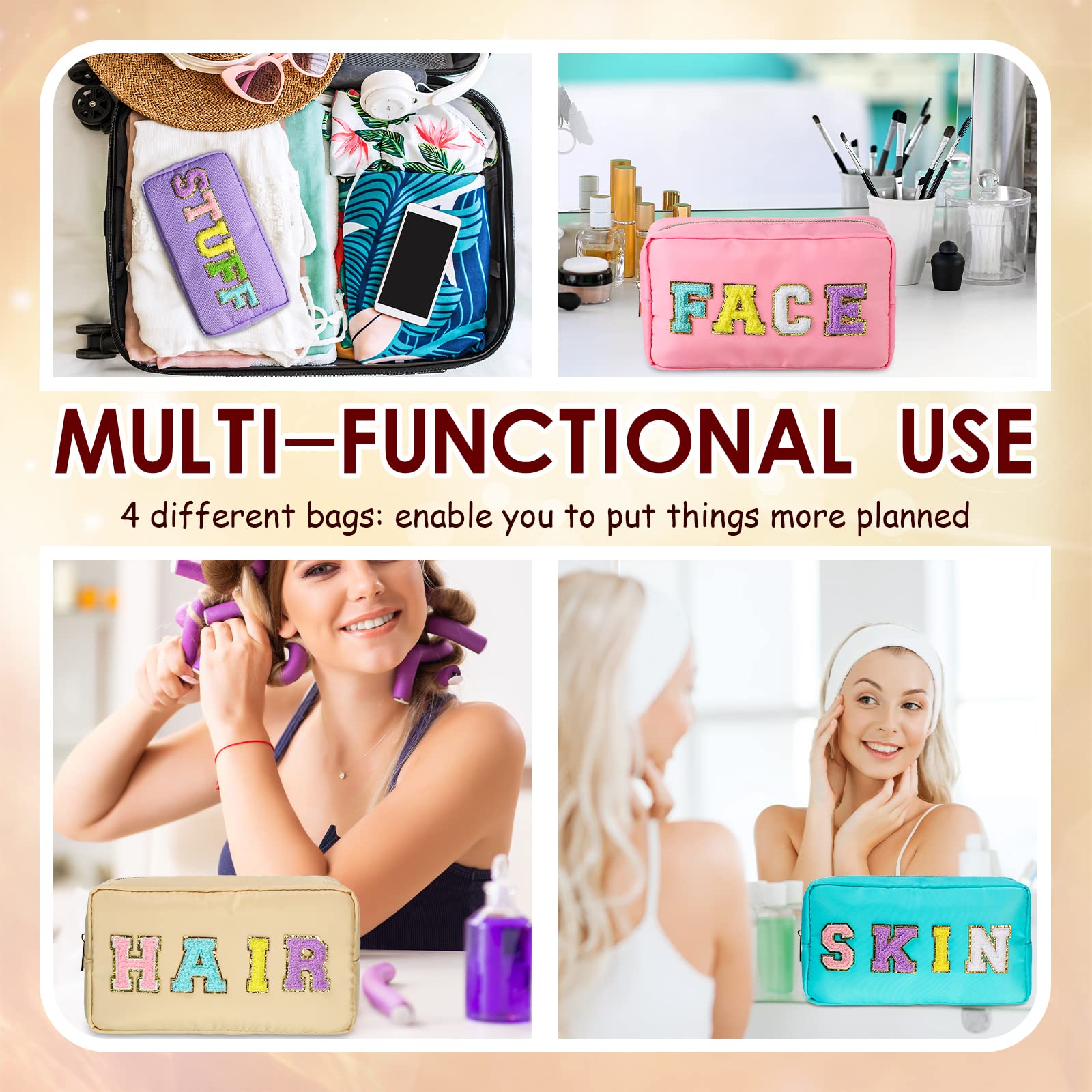 Remerry 4 Pcs Makeup Bag Travel Cosmetic Bag Organization Chenille Letter Toiletries Stuff Pouch Preppy Waterproof Bag Gift for Women Girl Teen (Colorful,Face Skin Hair Stuff)