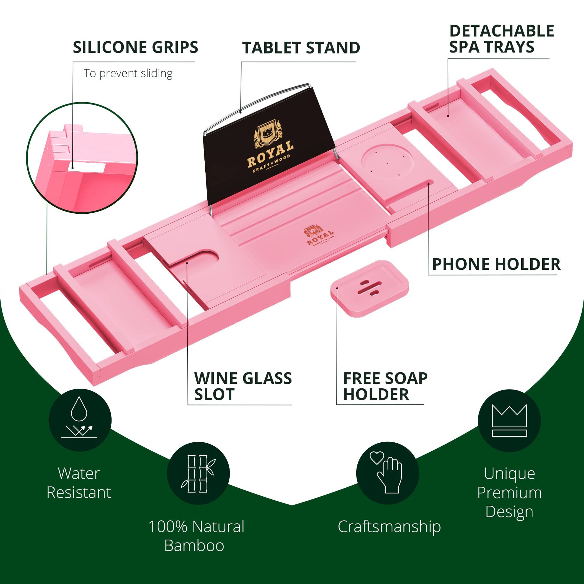 - LUXURY DESIGN - Pink bath caddy includes a waterproof book or tablet holder, slots for a wine glass or cup, and two removable trays for other essentials. Plus, you will get a free soap holder with a pink bath tray. Transform your bathroom into a SPA now with a Royal Craft Wood bamboo bathtub caddy tray.