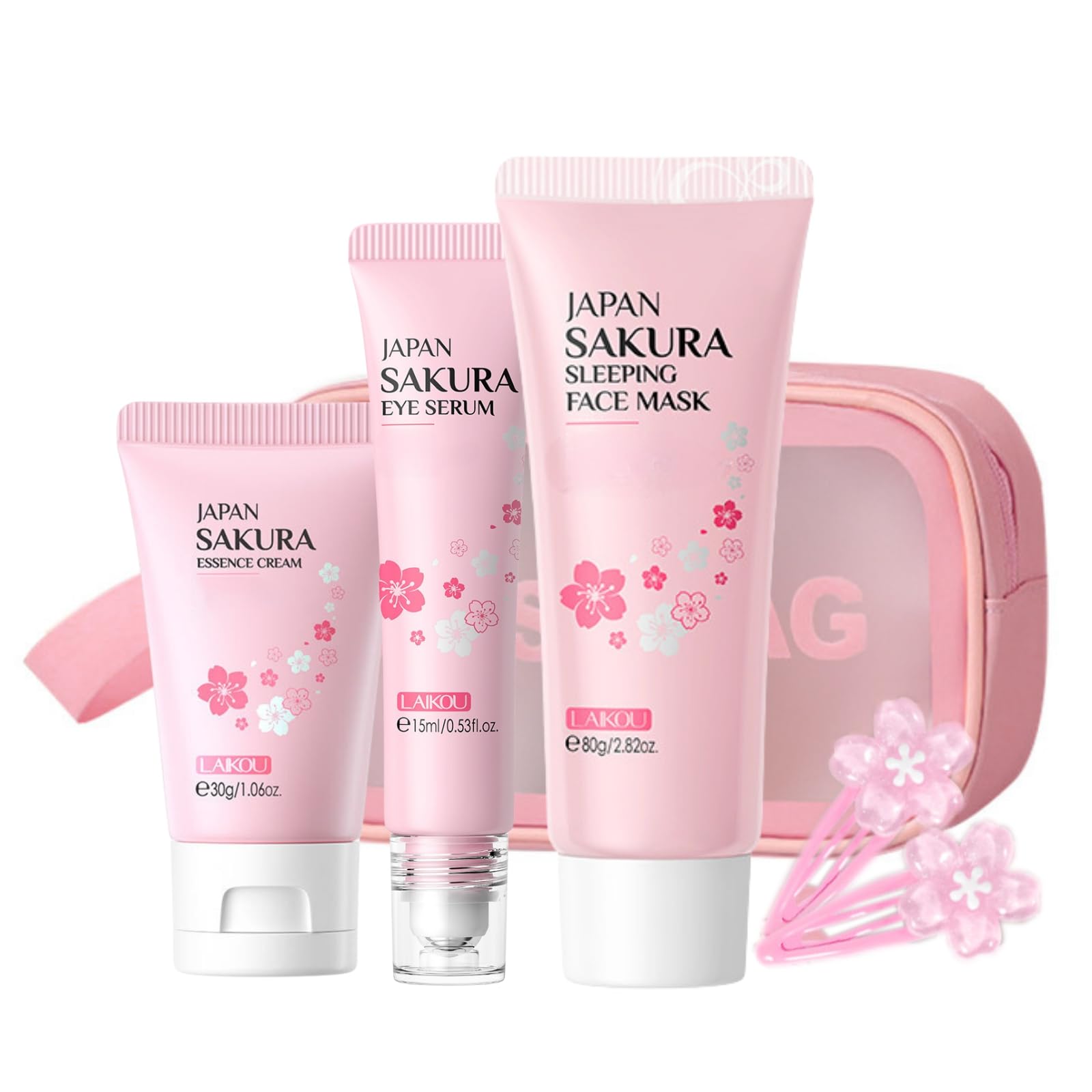 - 【Product Included in the Set】Our facial skin care set sakura includes an eye serum with a roller ball design for easy application,a luxurious sleeping face mask,a hydrating essence cream,a cute cosmetic bag for storage,and a lovely hairpin.This skin care kit gifts is a comprehensive package for all your face skin care.