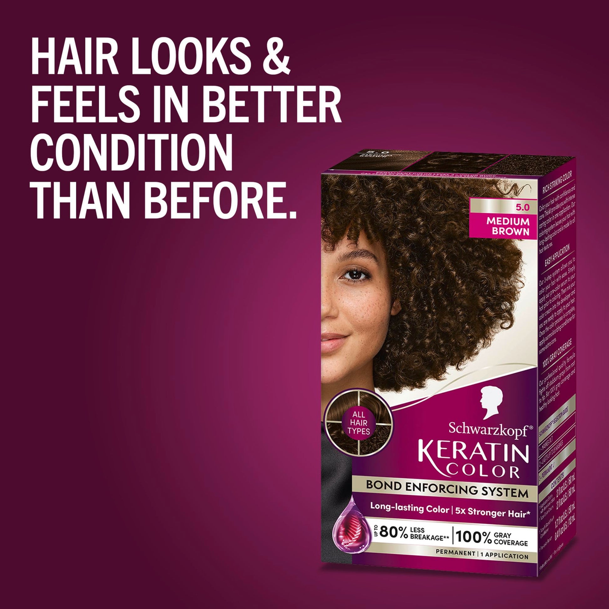 Details: Schwarzkopf Keratin Color Permanent Hair Dye Color Cream, 5.0 Medium Brown - Professionally-inspired hair color for womenThis permanent hair dye provides rich, striking color on all hair textures - with minimal damage*. The Keratin hair color formula was developed with professionals to provide professional-quality hair color and brilliant shine. In addition, our 3-step Bond Enforcing System creates bonds and strengthens your hair, leaving your hair 5x stronger** after coloring. Keratin Color also reduces frizz by providing humidity resistance for 72 hours.*** Our pre-color serum containing Vitamin B6 and Collagen, primes the hair. We recommend repeating the application of the hair dye in tube every 4 weeks for even color from root to tip. Established in 1898, Schwarzkopf has 125+ years of hair expertise, providing salon inspired hair color at home. The product benefits at a glance: Leaves hair 5x stronger**. Long-lasting color & root touch up. Pre-color serum with vitamin B6 and collagen. Suitable for all hair textures. Color: 5.0 Medium Brown. *Against combing breakage on damaged hair vs. untreated. **Against combing breakage on damaged hair vs. a non-conditioning shampoo. *** vs. untreated hair in high humidity conditions.