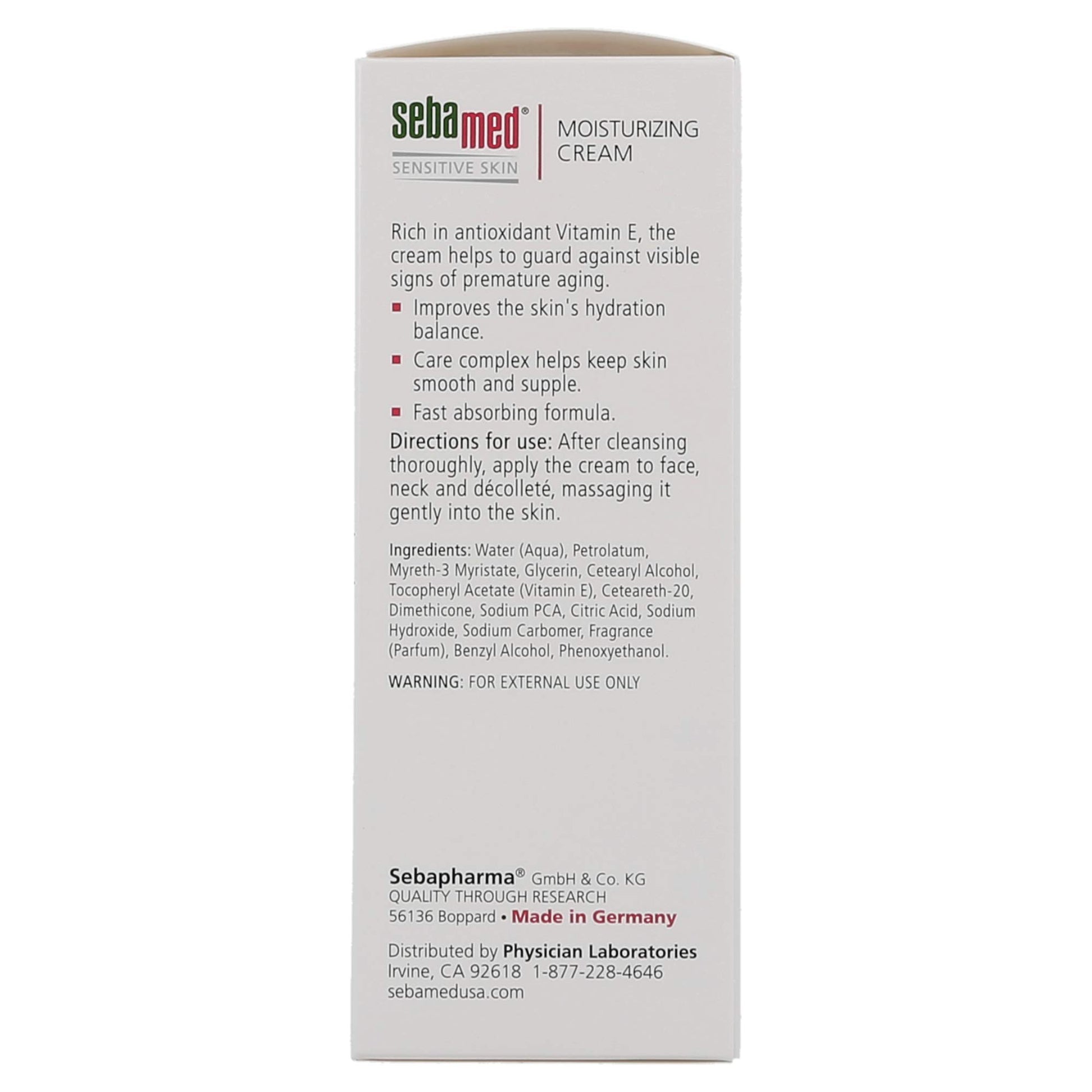Details: Our Sebamed moisturizing face cream for sensitive skin (2.6oz. / 75ml) is clinically tested to care and to protect facial skin against premature aging and prevention of the formation of wrinkles and lines. Features 26% lipid content making skin soft and smooth and 2% vitamin E help neutralize free radicals (which cause premature aging). Reduces water loss keeping the face with a fresh complexion. Easy application and rapid absorption.