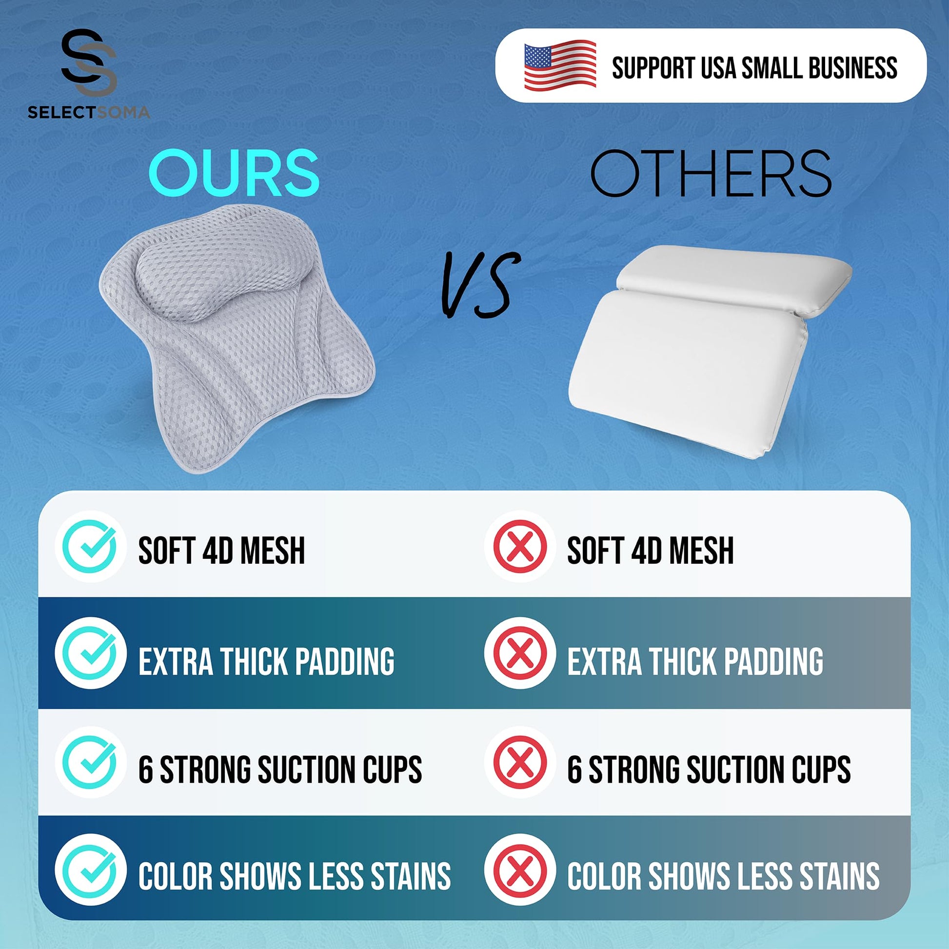 - ENHANCED STABILITY WITH 6 SUCTION CUPS: Enjoy uninterrupted relaxation with the SelectSoma bath pillow, featuring 6 large, non-slip suction cups that firmly adhere to any tub surface, ensuring your pillow stays in place without damaging the cushion.