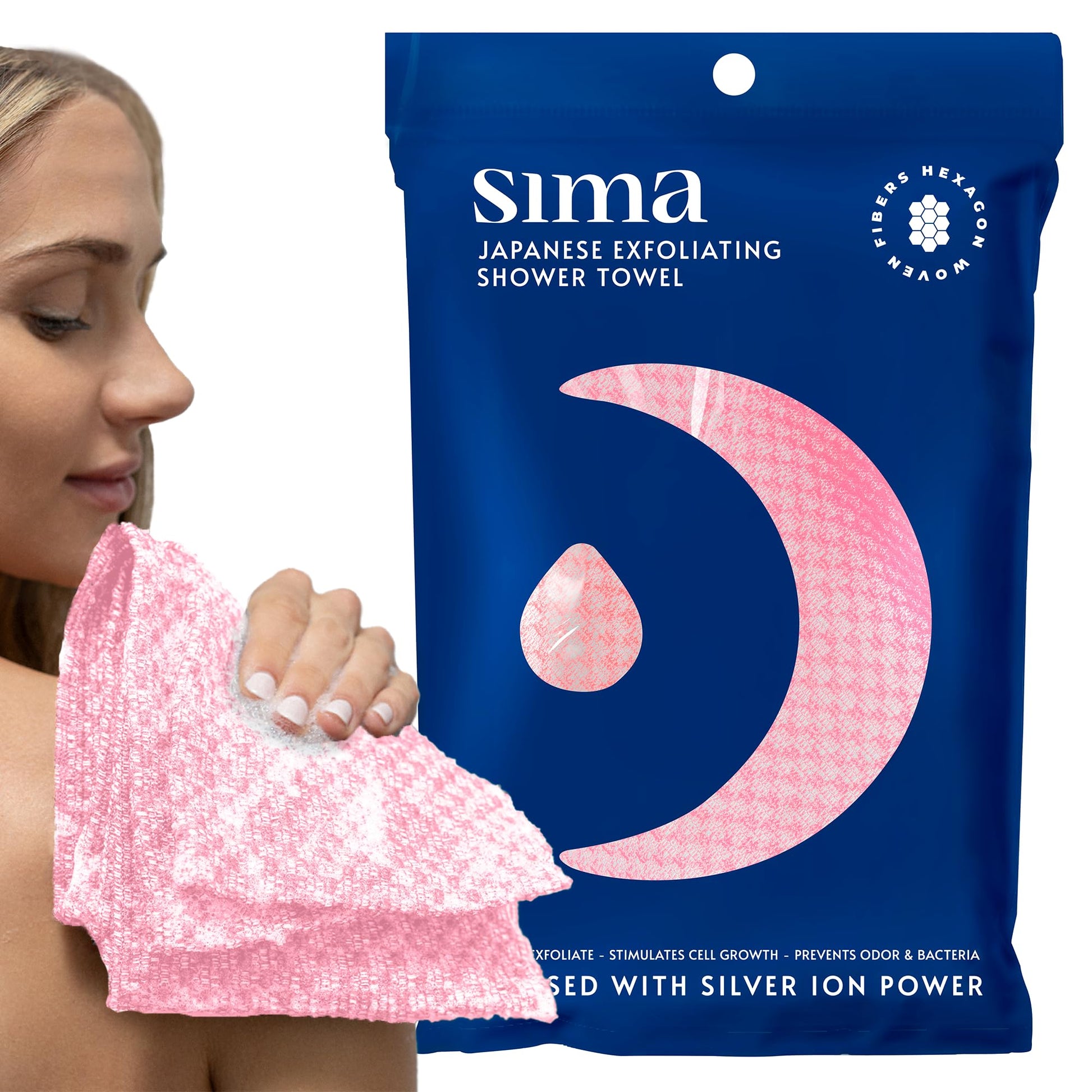 Sima Brand Exfoliating Washcloth Face & Body Scrub Towel - Japanese Exfoliating Towel with Hexagon Fibers, Body Scrubber with 2 Sides for Scrubbing & Washing Extra Long (Pink)
