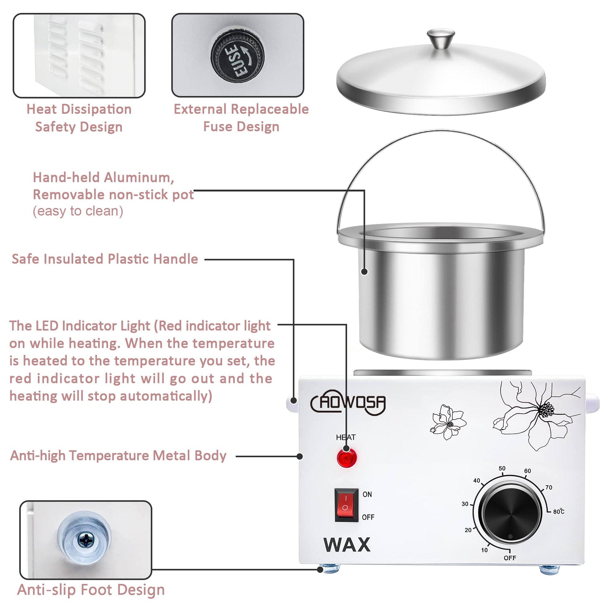 - 【Premium Material】AOWOSA professional single wax pot heater is made of stainless steel metal construction body and aluminum pot. strong and sturdy, Heats up fast. Brings great convenience to waxing work, very suitable for home, beauty salon, spa, barber shop, etc.