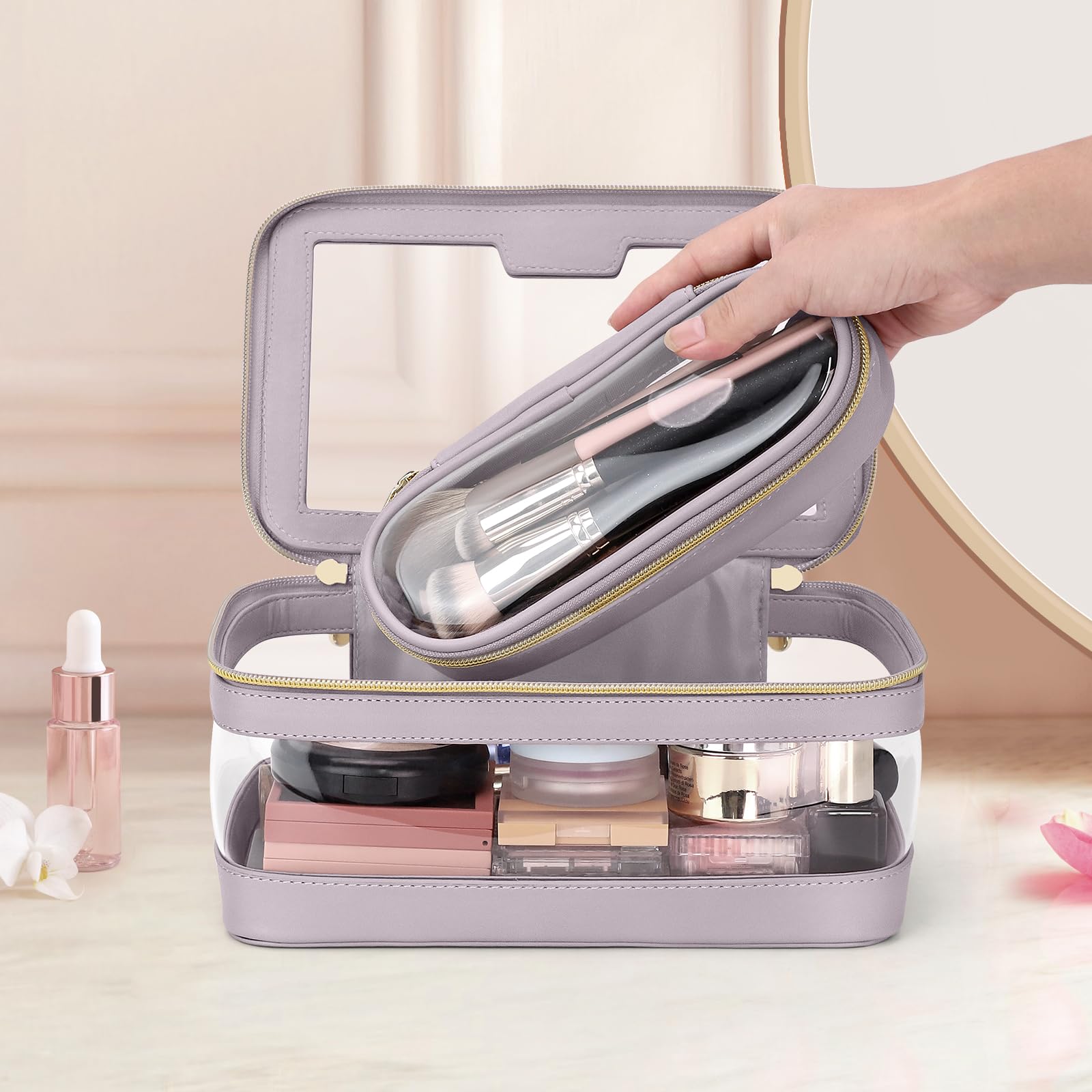 Soimeat Travel Clear Makeup Bag with Makeup Brush Bag, Leather Makeup Case Toiletry Bag, Portable Cosmetic Bag Case, Transparent Waterproof Cosmetic Organizer Storage Bag for Women, Purple