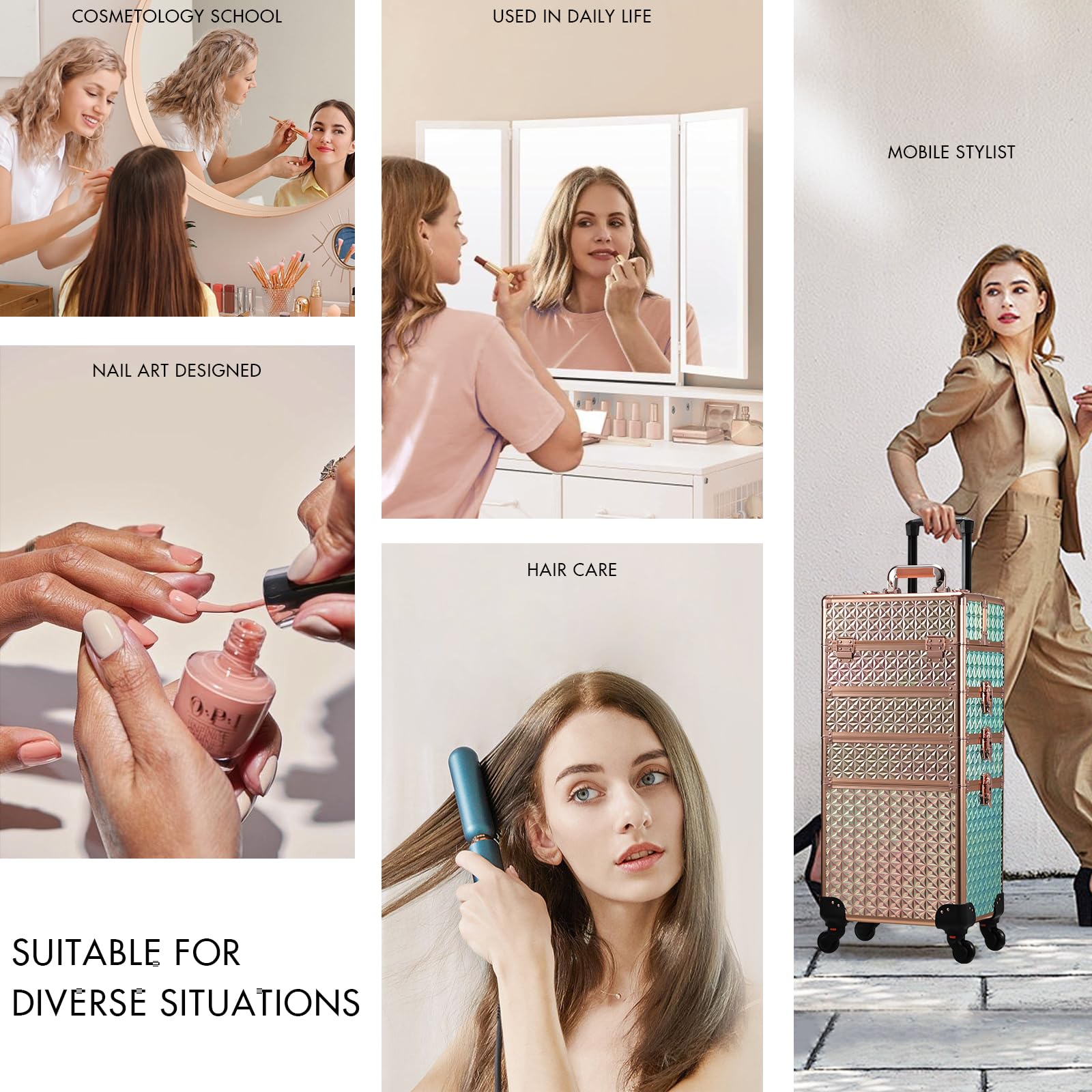 Stagiant Rolling Makeup Train Case Large Storage Cosmetic Trolley 4 in 1 Large Capacity Trolley Makeup Travel Case with Key Swivel Wheels Salon Barber Case Traveling Cart Trunk Shiny Rose Gold