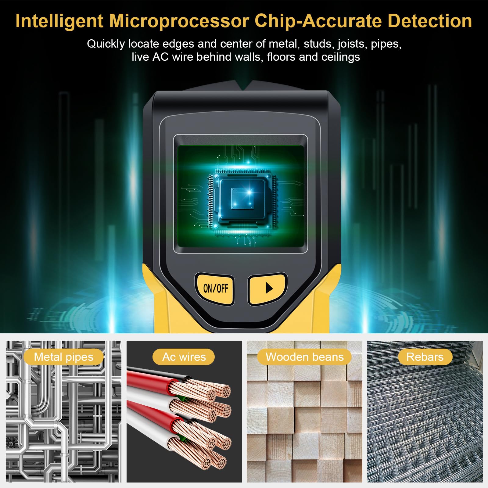 - Accurate and Rapid: The wall stud finder adopts an intelligent micro-sensor chip with the highest sensitivity which can accurately and quickly find edges and center of metal, studs, joists, pipes, and live AC wire behind walls, floors, and ceilings. Fast detection saves users time and effort, making task completion easier. It must be ultimate gifts for professionals, homeowner,s and DIY enthusiasts