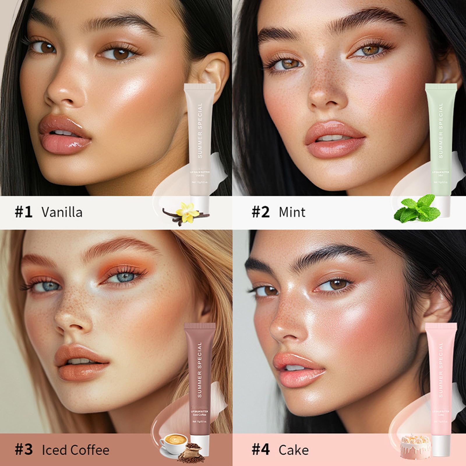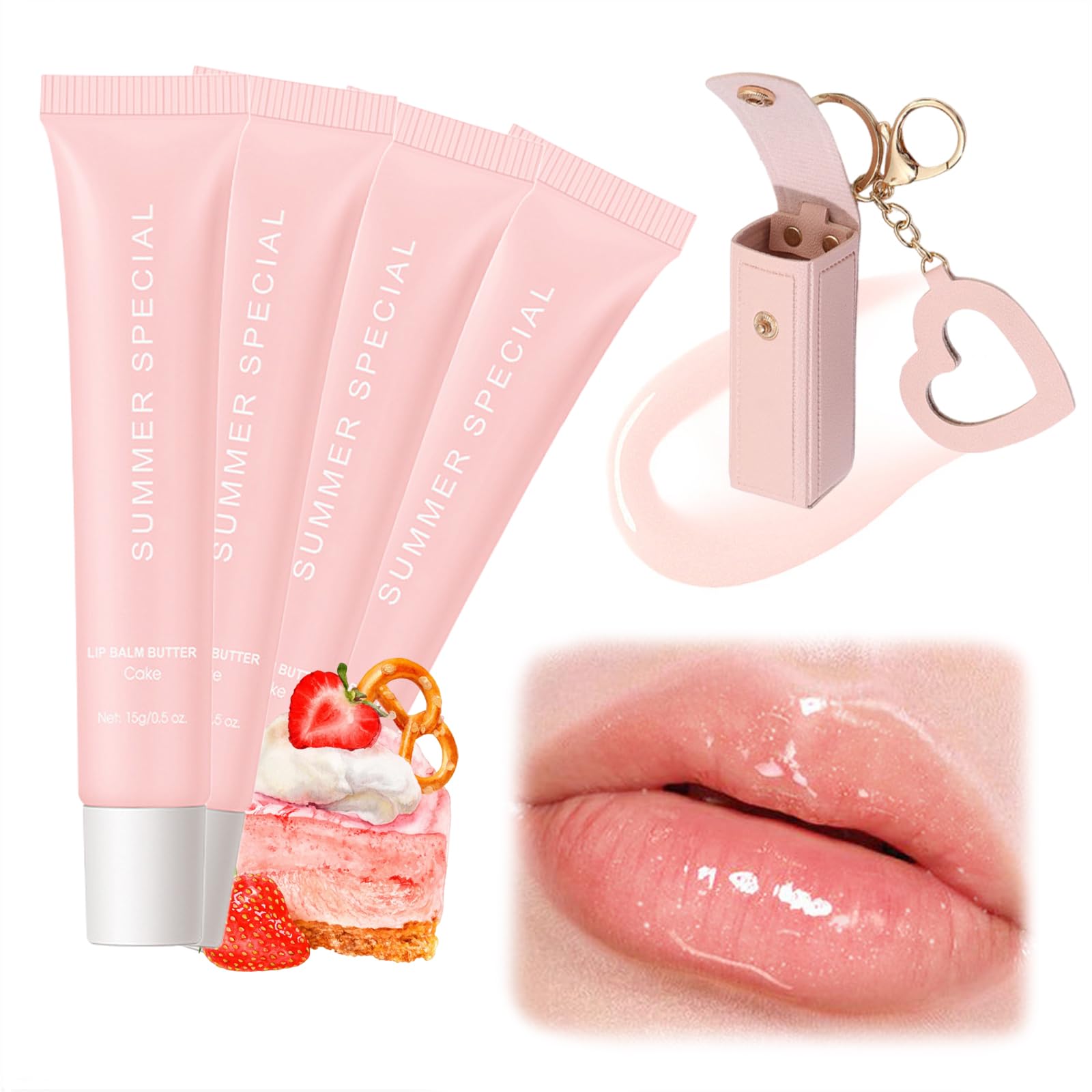 Summer Special Lip Balm Birthday Cake 4pack Set, Lip Butter Balm Shea Butter for Hydration & Shine, Plumping Butter Lip Gloss Clear for Women, Mini Long Lasting Lipstick (#4Cake)