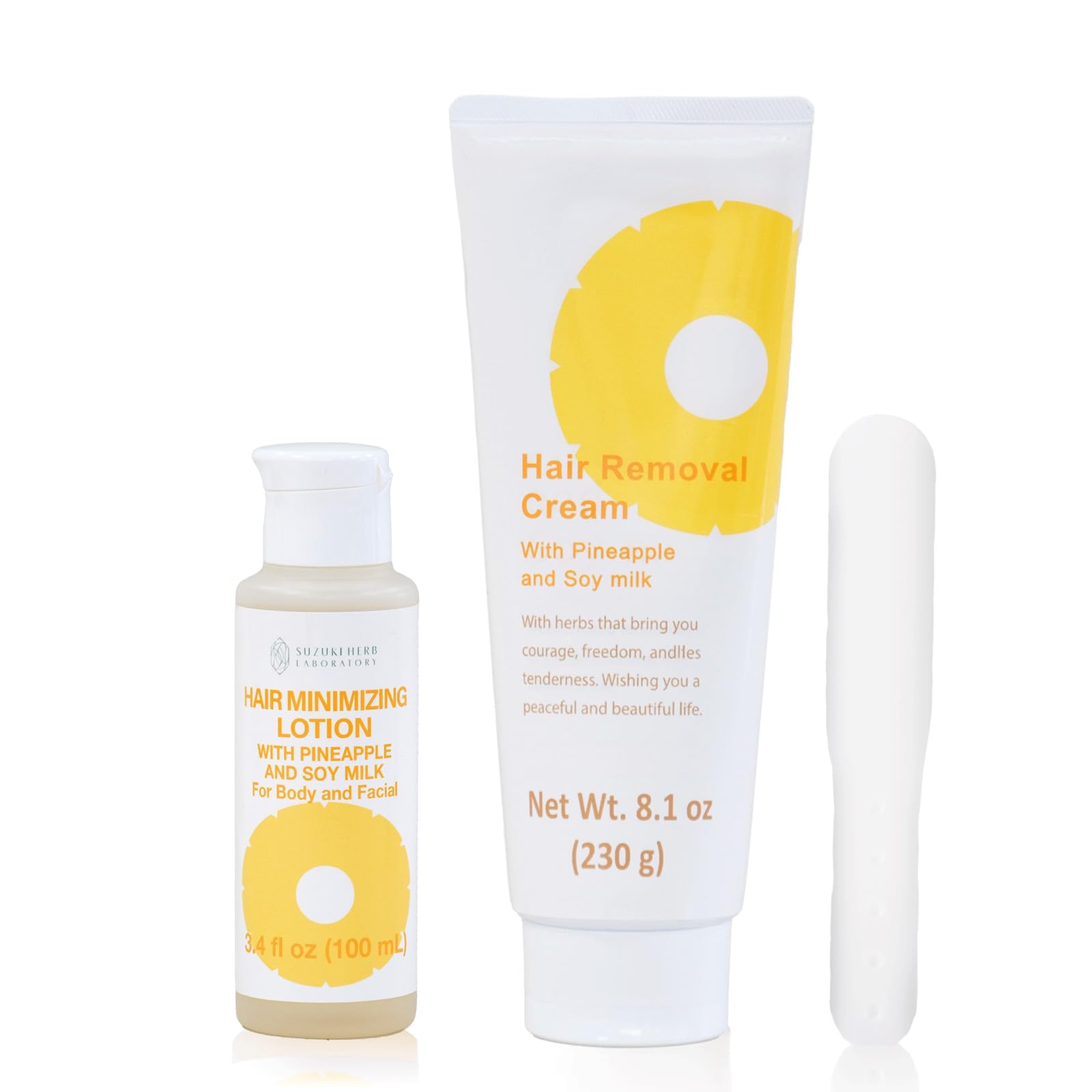 SUZUKI HERB LABORATORY Hair Removal Cream (8.1 OZ / 230g) and Hair Minimizing Lotion (3.52 FL. OZ / 100mL) with Pineapple and Soymilk for Sensitive Skin, Made in Japan