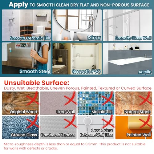 - REUSABLE & REMOVABLE: Shower mirror fogless for shaving can be easily removed without leaving any residue. Suction works best on ceramic tile, glass, mirror, stainless steel, acrylic, plastic, laminate, and any non-porous smooth surfaces. (Please clean the wall and keep it dry and attention to avoid the ceramic tile crack to make sure vacuum suction)