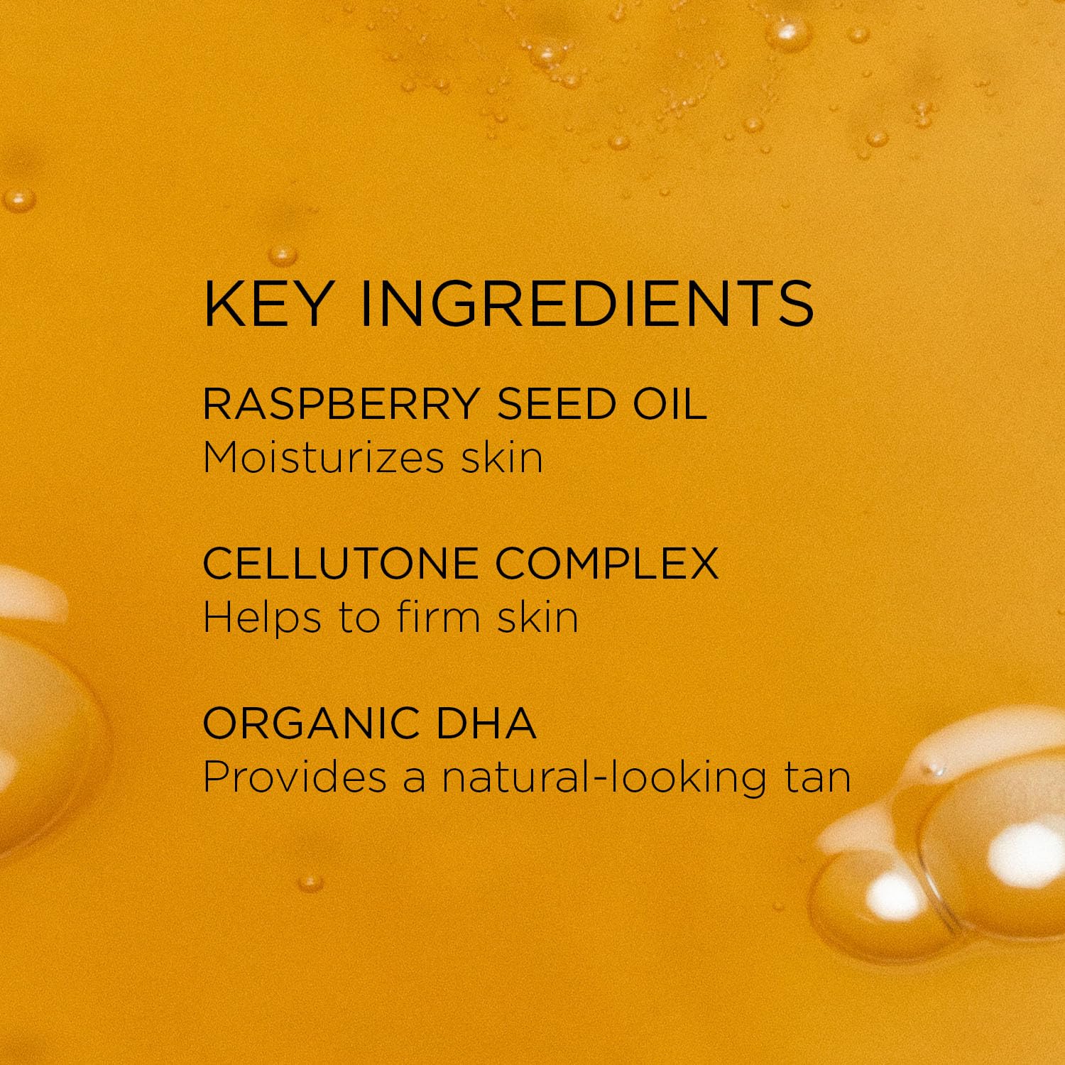 - Featuring Aloe Vera, Raspberry Seed Oil and Vitamin E to leave skin hydrated and luminous, never dried out; Caffiene tones and firms skin whilst evening skin tone and reducing redness; This gentle body tanner causes no streaks, no smells, no drama