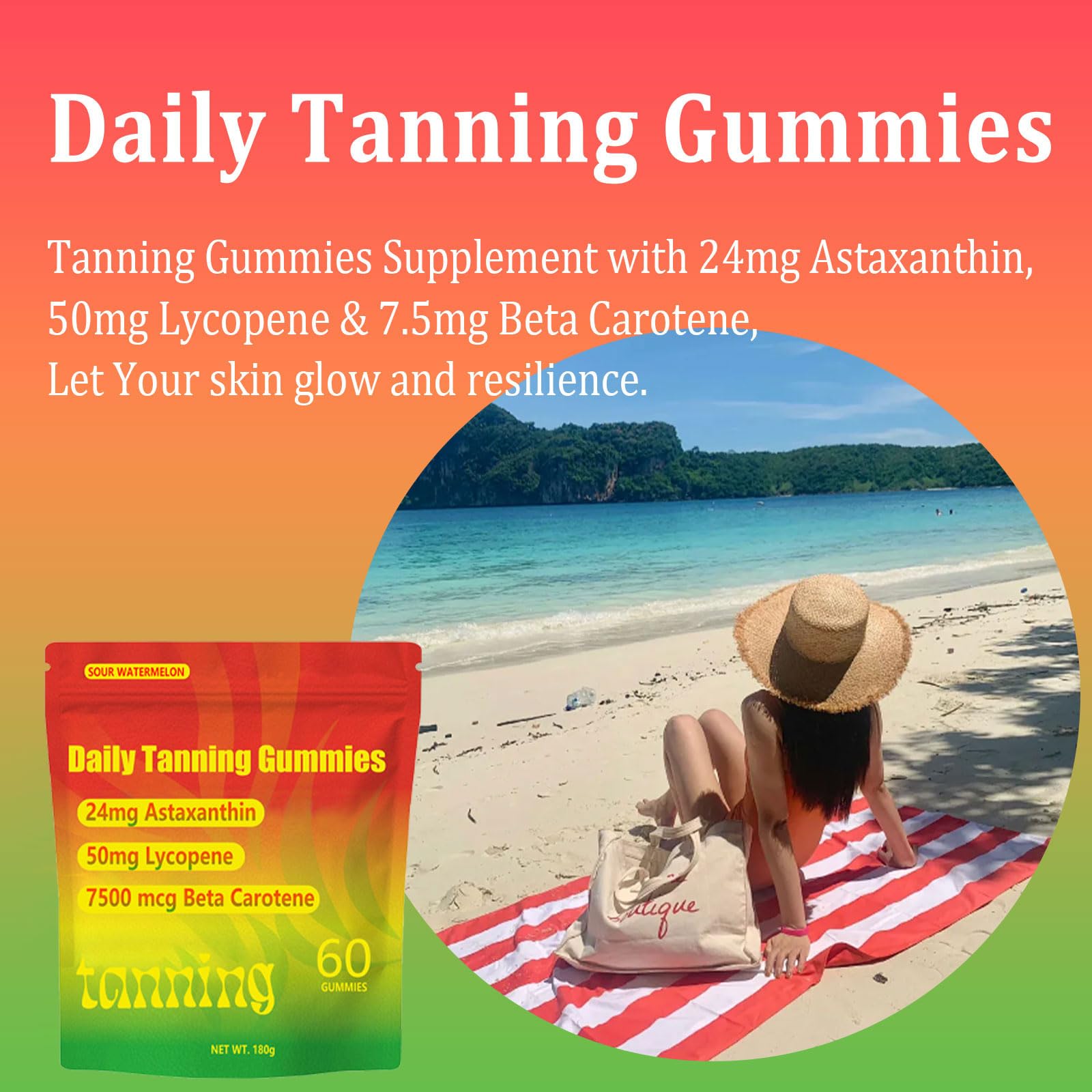 - 【Natural Formula】Tanning Gummies Supplement with 24mg Astaxanthin, 50mg Lycopene & 7.5mg Beta Carotene, Let Your skin glow and resilience.