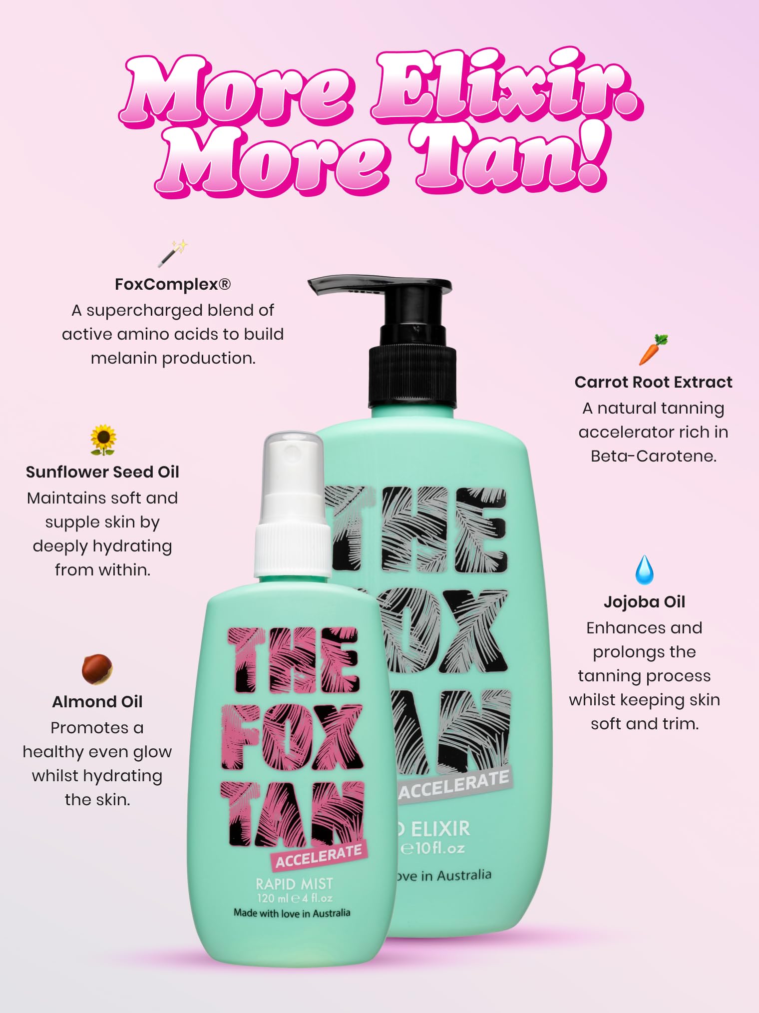 - SPEEDS UP YOUR TAN: This bundle includes Rapid Elixir & Mist, which were formulated to rapidly speed up your natural tanning process. The secret is FoxComplex - it prepares your skin by boosting melanin production which is vital for the tanning process.