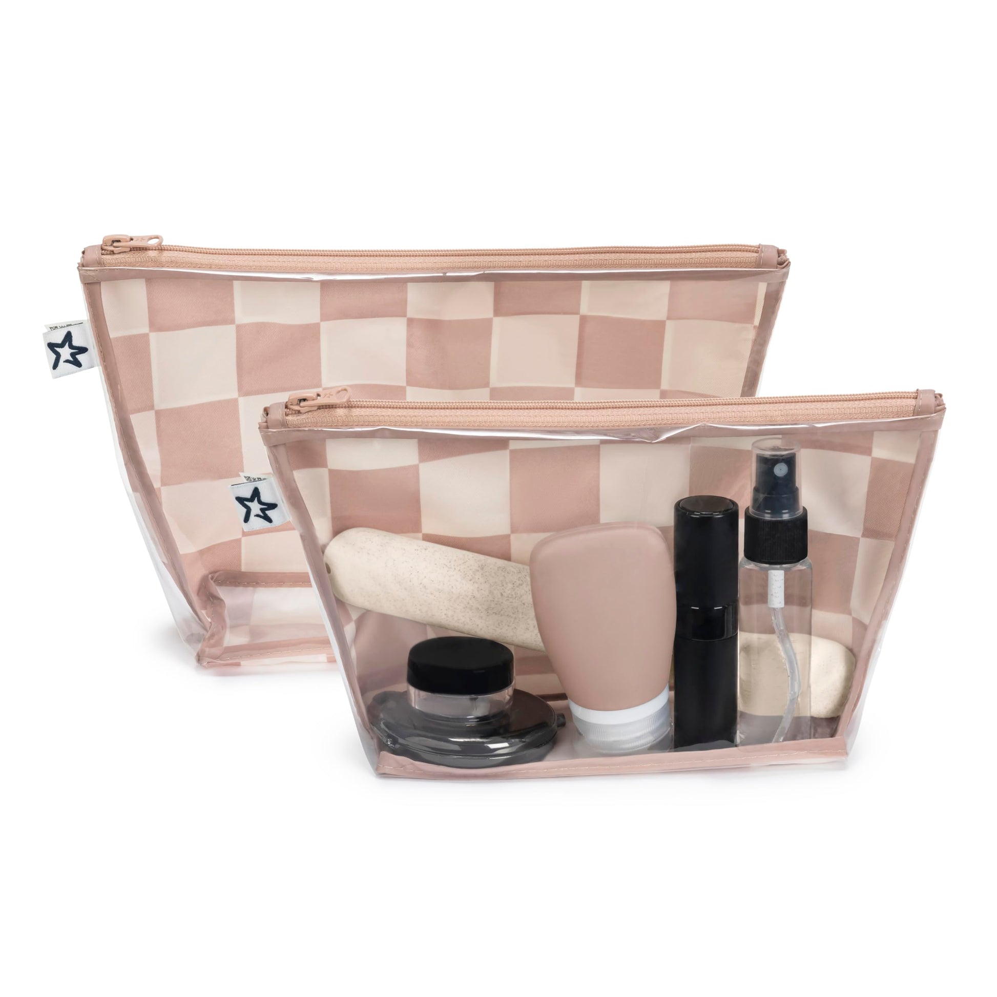 Tiny Twinkle Mess-proof Travel Bags, Airline Compliant, Zipper Closure, Clear Front Pouch, Diaper Bag Packing, Toiletry or Cosmetics Organizer 2 Pack Set (Beige Checkers)