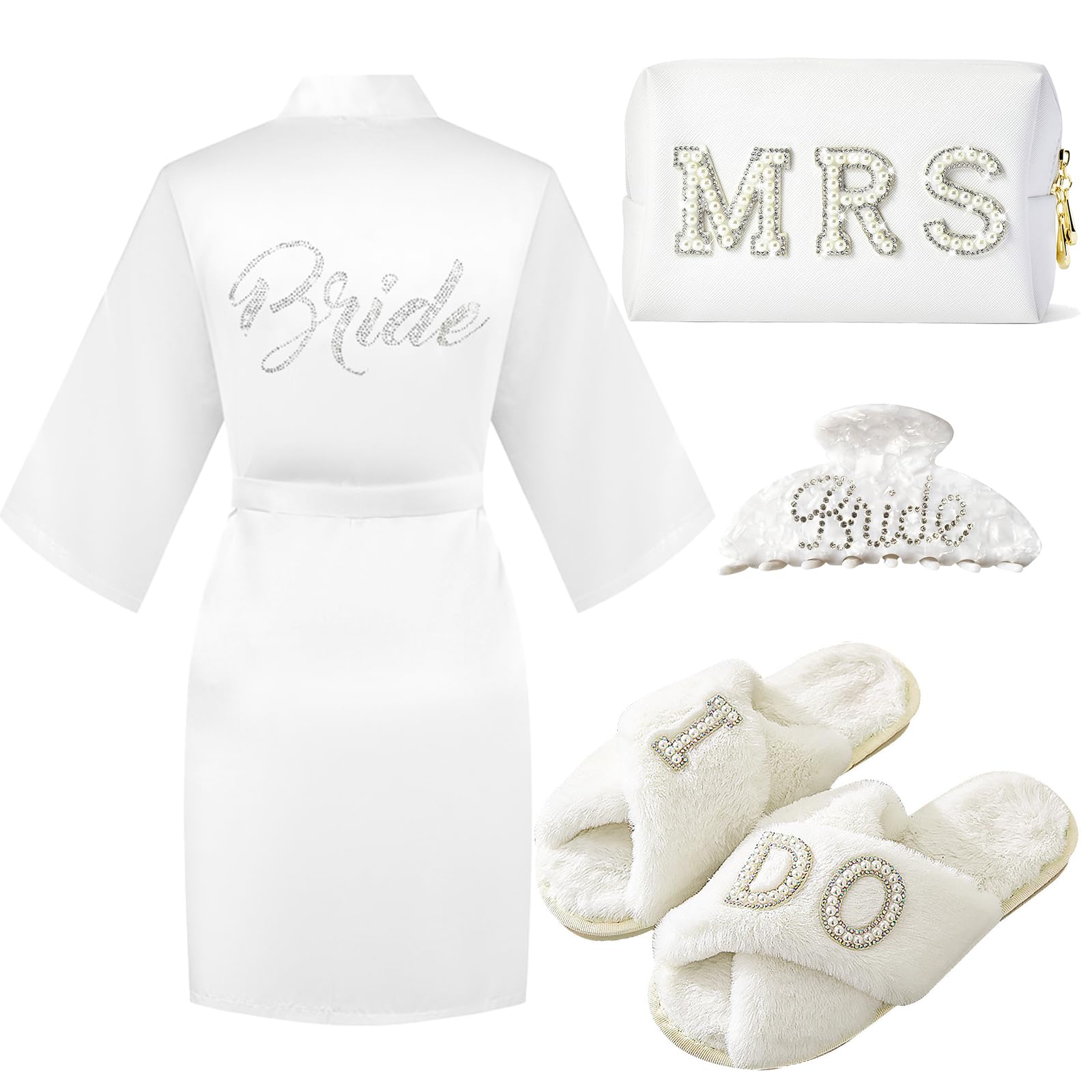 - Bride to Be Gift Set: The bride gift set comes with 1 piece of white MRS Makeup Bag, 1 pair of I do wedding slippers, and a white bride claw clip, there are three different items in total, believe it will be the excellent bride wedding gift companion!